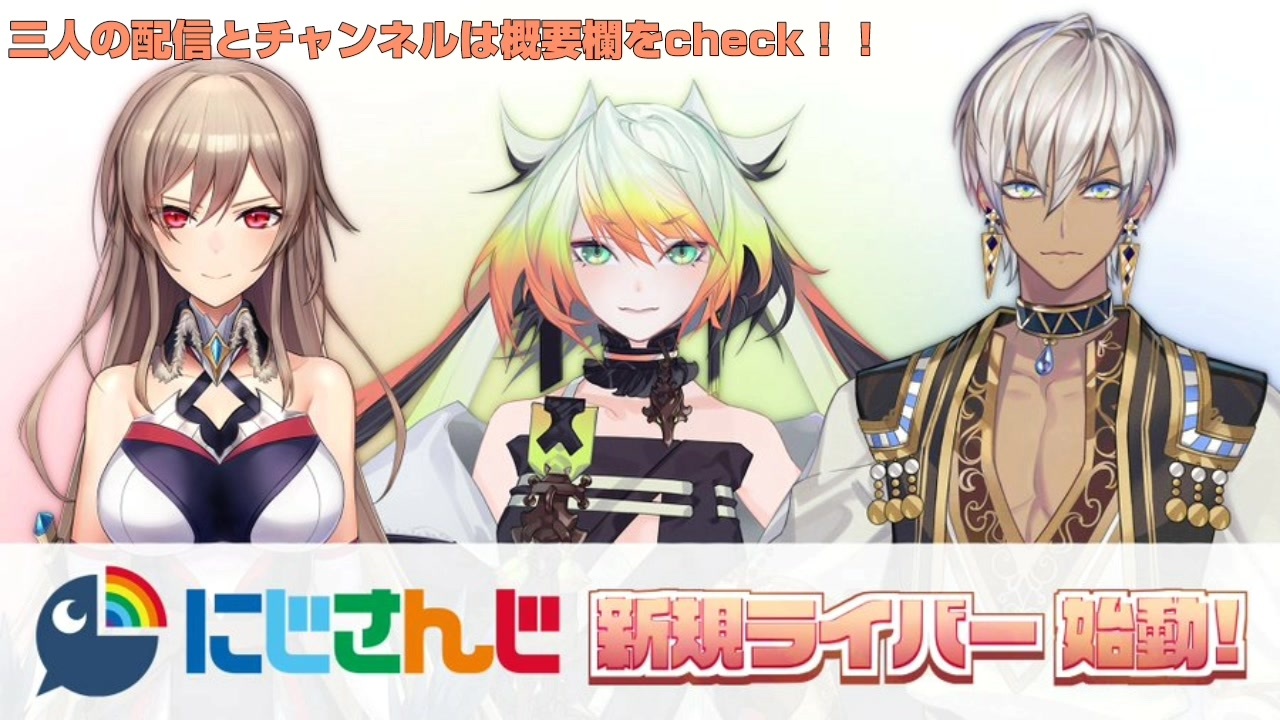 今年の新人さんもにじさんじですね<br><br>元配信<br>メリッサ・キンレンカ<br><a href="https://youtu.be/32-LvptsjsI" target="_blank" rel="noopener nofollow">https://youtu.be/32-LvptsjsI</a><br><br>フレン・E・ルスタリオ<br><a href="https://youtu.be/6dh2TTlvBdY" target="_blank" rel="noopener nofollow">https://youtu.be/6dh2TTlvBdY</a><br><br>イブラヒム<br><a href="https://youtu.be/dEB-XpbBBmo" target="_blank" rel="noopener nofollow">https://youtu.be/dEB-XpbBBmo</a><br><br>チャンネル<br>メリッサ・キンレンカ【にじさんじ】<br><a href="https://www.youtube.com/channel/UCwcyyxn6h9ex4sMXGtpQE_g" target="_blank" rel="noopener nofollow">https://www.youtube.com/channel/UCwcyyxn6h9ex4sMXGtpQE_g</a><br><br>フレン・E・ルスタリオ【にじさんじ】<br><a href="https://www.youtube.com/channel/UCuep1JCrMvSxOGgGhBfJuYw" target="_blank" rel="noopener nofollow">https://www.youtube.com/channel/UCuep1JCrMvSxOGgGhBfJuYw</a><br><br>イブラヒム【にじさんじ】<br><a href="https://www.youtube.com/channel/UCmZ1Rbthn-6Jm_qOGjYsh5A" target="_blank" rel="noopener nofollow">https://www.youtube.com/channel/UCmZ1Rbthn-6Jm_qOGjYsh5A</a><br><br><br>デビュー告知動画【公式】<br> <a href="https://youtu.be/CUmYCpci70Y" target="_blank" rel="noopener nofollow">https://youtu.be/CUmYCpci70Y</a> <br><br>にじさんじ公式チャンネル<br> <a href="https://www.youtube.com/channel/UCX7YkU9nEeaoZbkVLVajcMg" target="_blank" rel="noopener nofollow">https://www.youtube.com/channel/UCX7YkU9nEeaoZbkVLVajcMg</a>