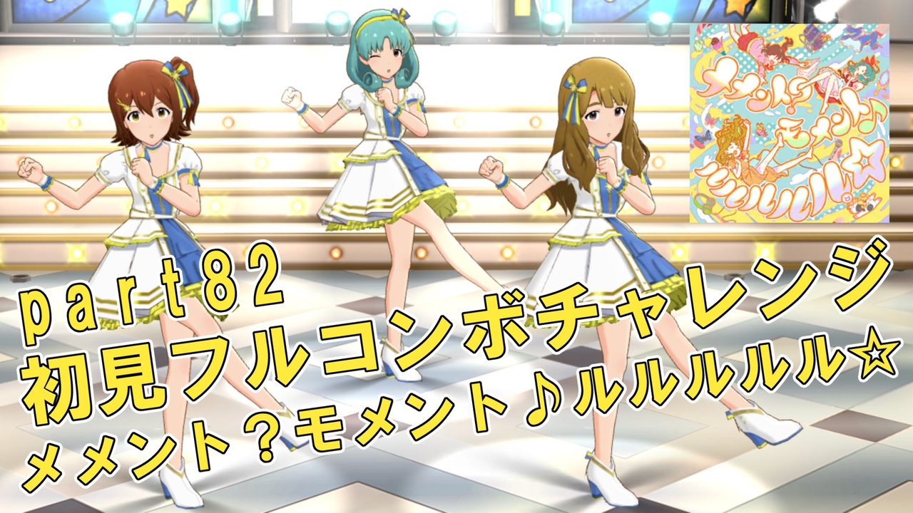 最近メメントすることが多くなった気がします。<br><br>チャレンジ楽曲:「メメント?モメント♪ルルルルル☆」<br><br>ルール<br>・「6MIX」と「MILLION MIX」の2つのライブコースをチャレンジ<br>・プレイする曲を歌っているアイドルをユニットに入れること<br>例) 楽曲が「IMPRESSION→LOCOMOTION!」なら「ロコ」をユニットに入れること<br>・ライブ画質は「3D高画質」 <br>・速度やリズムアイコンの色、SE等の設定は自由<br>・6MIX、MILLION MIX 片方フルコンボ失敗したら10連ガシャ<br>・6MIX、MILLION MIX 両方フルコンボ失敗したら20連ガシャ<br>・最後まで完走せずクリアすらできなかったら+10連ガシャ<br>・スペシャルorアナザーアピール前に失敗した場合は10連分のジュエルを購入するころ<br>※ガシャは衣装購入等で入手した10連チケットの使用はOK、無料10連でのガシャはNG<br><br><a href="https://www.nicovideo.jp/watch/sm36305456" class="watch">sm36305456</a> ← part81 | part83 → <a href="https://www.nicovideo.jp/watch/sm36357122" class="watch">sm36357122</a><br><br>こちらも併せてお楽しみください<br>【ミリシタ実況】ロコを迎えようとした人の記録【限定復刻ガシャ】<br><a href="https://www.nicovideo.jp/watch/sm36302387" class="watch">sm36302387</a><br><br>ミリシタ初見フルコンボチャレンジシリーズ<br><a href="https://www.nicovideo.jp/mylist/62779106" target="_blank" rel="noopener">mylist/62779106</a> <br><br>Twitter:<a href="https://twitter.com/sya_mojy" target="_blank" rel="noopener nofollow">https://twitter.com/sya_mojy</a>