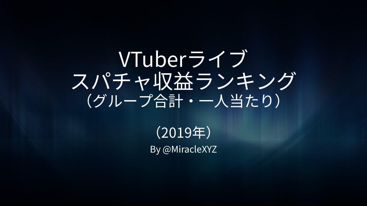 ニコニコの皆さん、初めまして。MiracleXYZです。<br>Nice to meet you, Niconico! I'm MiracleXYZ.<br><br>このビデオは、合計と平均を含むグループで割ったスーパーチャットのランキングについてです。 私はいくつかのアドバイスを聞き、このビデオを作りました。 気に入ってくれるといいな!<br>This video is about the Super Chat ranking divided by groups, including total sum and average. I listened to some of the advice and made this video. I hope you like it!<br><br>ご支援ありがとうございます。<br>Thank you again for your support.<br><br>コンテンツはGoogle翻訳を使用して翻訳されるため、一部の文は日本語の文法に一貫性がない場合があります。ご不便をおかけして大変申し訳ありません。<br>Since the content is translated using Google Translate, some sentences may not be consistent in Japanese grammar. I'm very sorry for the inconvenience.<br><br>————<br>データソース:<br>- スパチャ:自作データベース<br>- VTuber基本情報:VNUMA ( <a href="https://hiyoko.sonoj.net/" target="_blank" rel="noopener nofollow">https://hiyoko.sonoj.net/</a> )<br><span style="color: #000000; font-size: 13px;">Template: <a href="https://github.com/LePtC/AutoAni" target="_blank" rel="noopener nofollow">https://github.com/LePtC/AutoAni</a></span><br>Music: Stream - DOVA-SYNDROME (<a href="https://dova-s.jp/bgm/play1988.html)" target="_blank" rel="noopener nofollow">https://dova-s.jp/bgm/play1988.html)</a>