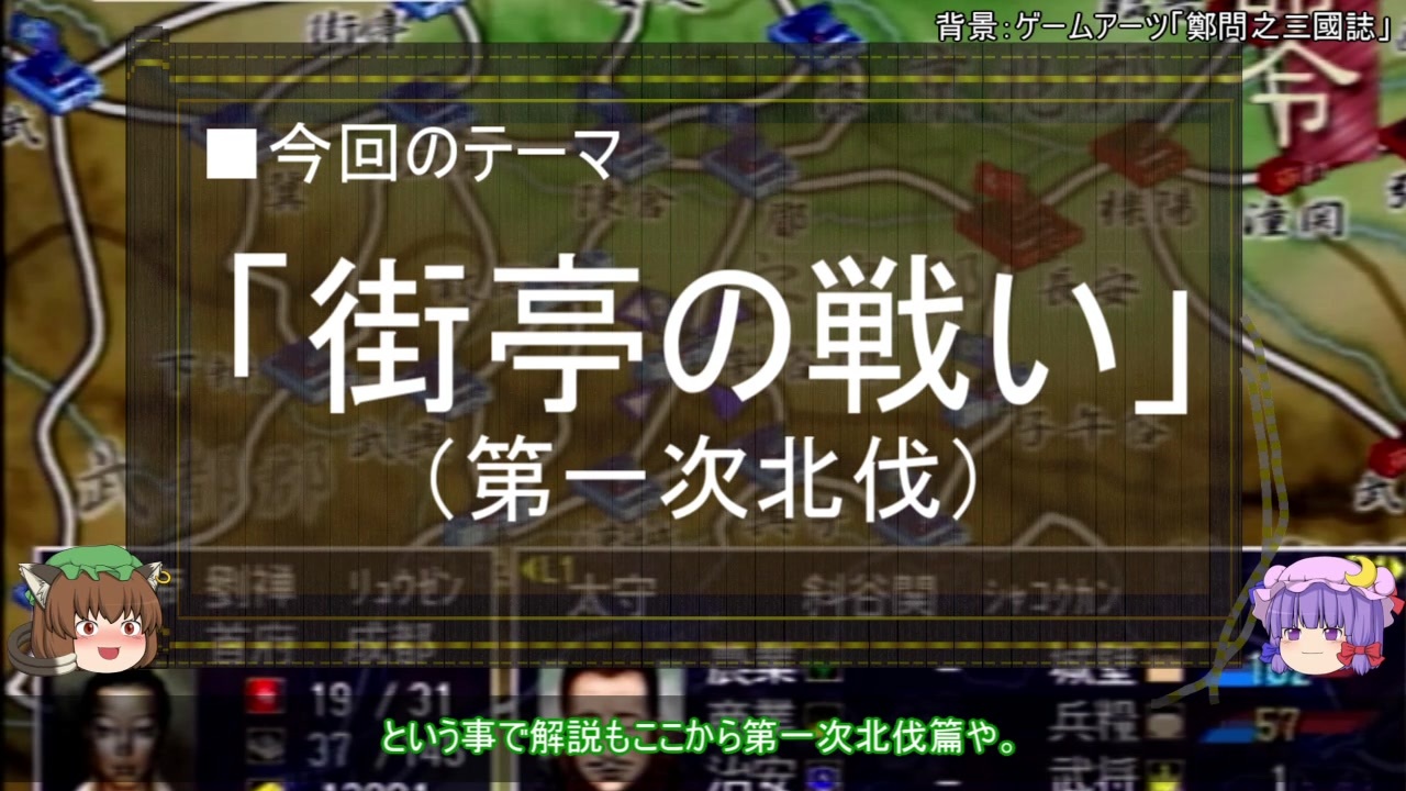 <span style="color: rgba(0, 0, 0, 0.87); font-size: 15px;">伐解説第四回は、街亭の戦いに関する考察前編です。<br>今回は最後まで蜀軍を苦しめる「兵站」の説明が中心です。<br><br>解説 :パチュリー<br>曹叡 :橙<br>諸葛亮 :映姫<br>夏侯楙 :てゐ<br>趙雲 :マミゾウ</span><br><br>■次回(街亭の戦い 中編)<br><a href="https://www.nicovideo.jp/watch/sm36428680" class="watch">sm36428680</a><br><br><span style="color: rgba(0, 0, 0, 0.87); font-size: 15px;">■前回(北伐 出師の表編)</span><br><a href="https://www.nicovideo.jp/watch/sm36213769" class="watch">sm36213769</a><br><br><span style="color: rgba(0, 0, 0, 0.87); font-size: 15px;">☆参考サイト<br>■三国志、全文検索<br><a href="http://www.seisaku.bz/sangokushi.html" target="_blank" rel="noopener nofollow">http://www.seisaku.bz/sangokushi.html</a><br><br>BGM: 【公式・高音質】One's Believes【H/MIX】- 秋山裕和<br><a href="https://www.youtube.com/watch?v=1ov1lpA6NtA" target="_blank" rel="noopener nofollow">https://www.youtube.com/watch?v=1ov1lpA6NtA</a><br><br>動画作成ツール:ゆっくりムービーメーカー3<br><a href="https://manjubox.net/ymm3/" target="_blank" rel="noopener nofollow">https://manjubox.net/ymm3/</a><br><br>立ち絵:キャラ素材(きつねゆっくり) - Nicotalk &キャラ素材配布所<br><a href="http://www.nicotalk.com/charasozai_kt.html" target="_blank" rel="noopener nofollow">http://www.nicotalk.com/charasozai_kt.html</a><br><br>背景:鄭問之三國誌</span>