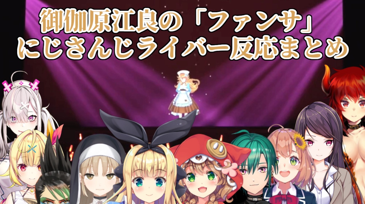 <span style="color: rgba(0, 0, 0, 0.87); font-size: 15px;">御伽原江良は、ギバラは、アイドルで、シンデレラでした。</span><br><br>こちらのライブが収録されたブルーレイが発売中です。<br>是非ご購入下さい。<br><a href="https://shop.nijisanji.jp/s/niji/item/detail/NJSJ-010?ima=5039" target="_blank" rel="noopener nofollow">https://shop.nijisanji.jp/s/niji/item/detail/NJSJ-010?ima=5039</a><br><br><span style="color: rgba(0, 0, 0, 0.87); font-size: 15px;">・楽曲音源:ファンサ/mona(CV:夏川椎菜)【HoneyWorks】(</span><a href="https://www.nicovideo.jp/watch/sm35288422" class="watch">sm35288422</a><span style="color: rgba(0, 0, 0, 0.87); font-size: 15px;">)<br><br>・健屋花那<br>【YouTube】<br><a href="https://www.youtube.com/channel/UC8C1LLhBhf_E2IBPLSDJXlQ" target="_blank" rel="noopener nofollow">https://www.youtube.com/channel/UC8C1LLhBhf_E2IBPLSDJXlQ</a><br><br>・星川サラ<br>【YouTube】<br><a href="https://www.youtube.com/channel/UC9V3Y3_uzU5e-usObb6IE1w" target="_blank" rel="noopener nofollow">https://www.youtube.com/channel/UC9V3Y3_uzU5e-usObb6IE1w</a><br><br>・花畑チャイカ<br>【YouTube】<br><a href="https://www.youtube.com/channel/UCsFn_ueskBkMCEyzCEqAOvg" target="_blank" rel="noopener nofollow">https://www.youtube.com/channel/UCsFn_ueskBkMCEyzCEqAOvg</a><br><br>・物述有栖<br>【YouTube】<br><a href="https://www.youtube.com/channel/UCt0clH12Xk1-Ej5PXKGfdPA" target="_blank" rel="noopener nofollow">https://www.youtube.com/channel/UCt0clH12Xk1-Ej5PXKGfdPA</a><br><br>・緑仙<br>【YouTube】<br><a href="https://www.youtube.com/channel/UCt5-0i4AVHXaWJrL8Wql3mw" target="_blank" rel="noopener nofollow">https://www.youtube.com/channel/UCt5-0i4AVHXaWJrL8Wql3mw</a><br><br>・本間ひまわり<br>【YouTube】<br><a href="https://www.youtube.com/channel/UC0g1AE0DOjBYnLhkgoRWN1w" target="_blank" rel="noopener nofollow">https://www.youtube.com/channel/UC0g1AE0DOjBYnLhkgoRWN1w</a><br><br>・シスター・クレア<br>【YouTube】<br><a href="https://www.youtube.com/channel/UC1zFJrfEKvCixhsjNSb1toQ" target="_blank" rel="noopener nofollow">https://www.youtube.com/channel/UC1zFJrfEKvCixhsjNSb1toQ</a><br><br>・童田明治<br>【YouTube】<br><a href="https://www.youtube.com/channel/UCveZ9Ic1VtcXbsyaBgxPMvg" target="_blank" rel="noopener nofollow">https://www.youtube.com/channel/UCveZ9Ic1VtcXbsyaBgxPMvg</a><br><br>・御伽原江良<br>【YouTubeチャンネル】<br><a href="https://www.youtube.com/channel/UCwQ9Uv-m8xkE5PzRc7Bqx3Q" target="_blank" rel="noopener nofollow">https://www.youtube.com/channel/UCwQ9Uv-m8xkE5PzRc7Bqx3Q</a></span>