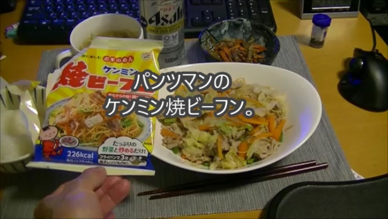 ケンミンの焼ビーフン。<br>米の粉の麺にチキン醤油の味がついている。肉や野菜と炒め蒸し焼きにして食べます。<br>フライパン一つで簡単に作れます。<br><br>ケンミンは神戸の会社で関西ローカルの不気味なCMを昔流してました。<br>ケンミンの焼きビーフン 焼きビーフン ケンミン食品のタグで検索してください。<br><br><span style="color: rgba(0, 0, 0, 0.87); font-size: 15px;">きょうのおかずはなんだろな<br>わーいやってねケンミンだ<br>ケンケンミンミン焼ビーフン<br>たまに食べるとおいしいよ<br>毎日食べるとちょっと飽きる</span>