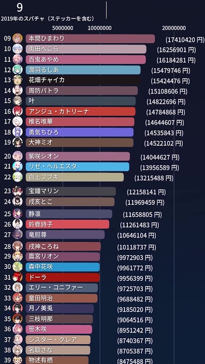 ニコニコの皆さん、こんにちは。MiracleXYZです。<br>Hello, Niconico! I'm MiracleXYZ.<br><br>このビデオでは、2019年のスーパーチャット収益ランキングのトップ100を紹介しています。<br>This video provides the TOP 100 of 2019 Super Chat Revenue Ranking.<br><br>コンテンツはGoogle翻訳を使用して翻訳されるため、一部の文は日本語の文法に一貫性がない場合があります。ご不便をおかけして大変申し訳ありません。<br>Since the content is translated using Google Translate, some sentences may not be consistent in Japanese grammar. I'm very sorry for the inconvenience.<br><br>————<br>データソース:<br>- スパチャ:自作データベース<br>- VTuber基本情報:VNUMA ( <a href="https://hiyoko.sonoj.net/" target="_blank" rel="noopener nofollow">https://hiyoko.sonoj.net/</a> )<br>Template: <a href="https://github.com/LePtC/AutoAni" target="_blank" rel="noopener nofollow">https://github.com/LePtC/AutoAni</a><br>Music: Tobu - Rollercoaster ( <a href="https://tobu.io/Rollercoaster/download" target="_blank" rel="noopener nofollow">https://tobu.io/Rollercoaster/download</a> )