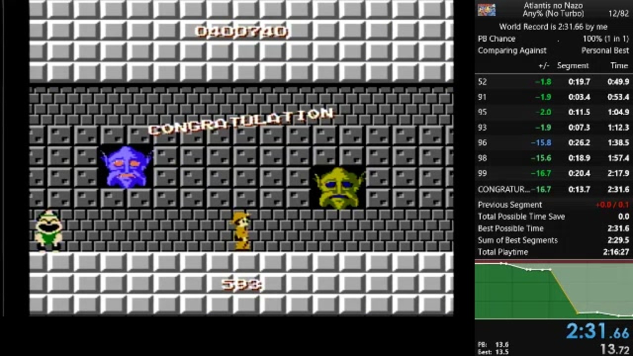 <strong>【追記】抜かれました<br><a href="https://www.twitch.tv/videos/1175649800" target="_blank" rel="noopener nofollow">https://www.twitch.tv/videos/1175649800</a></strong><br><br>2020年2月16日にTwitchにて達成<br>あまりに完璧な走りだったので自分でもびっくりしてます<br><br>【解説】<br>11面: 開始した瞬間に右を押しながら素早くB→Aと短く入力<br>52面: 地味に難しい 虫の配置が何パターンかあるうちのランダムなので、最速で行こうとするとどうしようもないパターンが来ることも<br>93面: 更新余地 ボムを空中で先置きして隠し扉を出せる また、隠し扉を出す瞬間(猶予1F?2F?)にポーズすると、隠し扉が出ると同時に扉が開く どちらもシビアな技なので今回は取り入れていない (前者は連射ありのRTAで取り入れている方がいた: <a href="https://youtu.be/HGp_5YB4Db8" target="_blank" rel="noopener nofollow">https://youtu.be/HGp_5YB4Db8</a> ※連射ありとなしとではカテゴリが分かれている)<br>96面: 連射なしRTAの鬼門 狭い通路では素早くジャンプを続けることで敵が湧かなくなるが、タイミングがシビアなので敵を1体も出さずに通過するのは難しい 私は何回もやってタイミングを把握したうえで、早すぎず遅すぎずの一定のテンポで押している 段差での引っ掛かりはあったものの、通路で敵を1体も出さずに通過できたので気にしていない<br>98面: 最後のジャンプ降りは最大ジャンプをするようにすると安定する<br>99面: 更新余地 <span style="color: #000000; font-size: 13px;">隠し扉を出す瞬間にポーズ(ry こちらもシビアな技なので今回は取り入れていない 被弾した瞬間はヒヤリハットだった<br>100面: 動画を見て何回も繰り返し練習しましょう 私はメモ帳にジャンプの高さとタイミングを書いて覚えました (私のメモ帳には「大中小 大大 中小小 中」と書いてある)</span><br><br>アトランチスの謎RTAの記録集: <a href="https://www.speedrun.com/atlantis_no_nazo" target="_blank" rel="noopener nofollow">https://www.speedrun.com/atlantis_no_nazo</a><br><br>私が今までに走ったRTA: <a href="https://www.speedrun.com/user/mammaru339" target="_blank" rel="noopener nofollow">https://www.speedrun.com/user/mammaru339</a><br><br>普段はTwitchで不定期に配信してます、良かったら見に来てください: <a href="https://www.twitch.tv/mammaru339" target="_blank" rel="noopener nofollow">https://www.twitch.tv/mammaru339</a><br><br><span style="color: #000000; font-size: 13px;">Twitterもやってます、良かったらフォローしてください: </span><a href="https://twitter.com/mammaru339" target="_blank" rel="noopener nofollow">https://twitter.com/mammaru339</a>