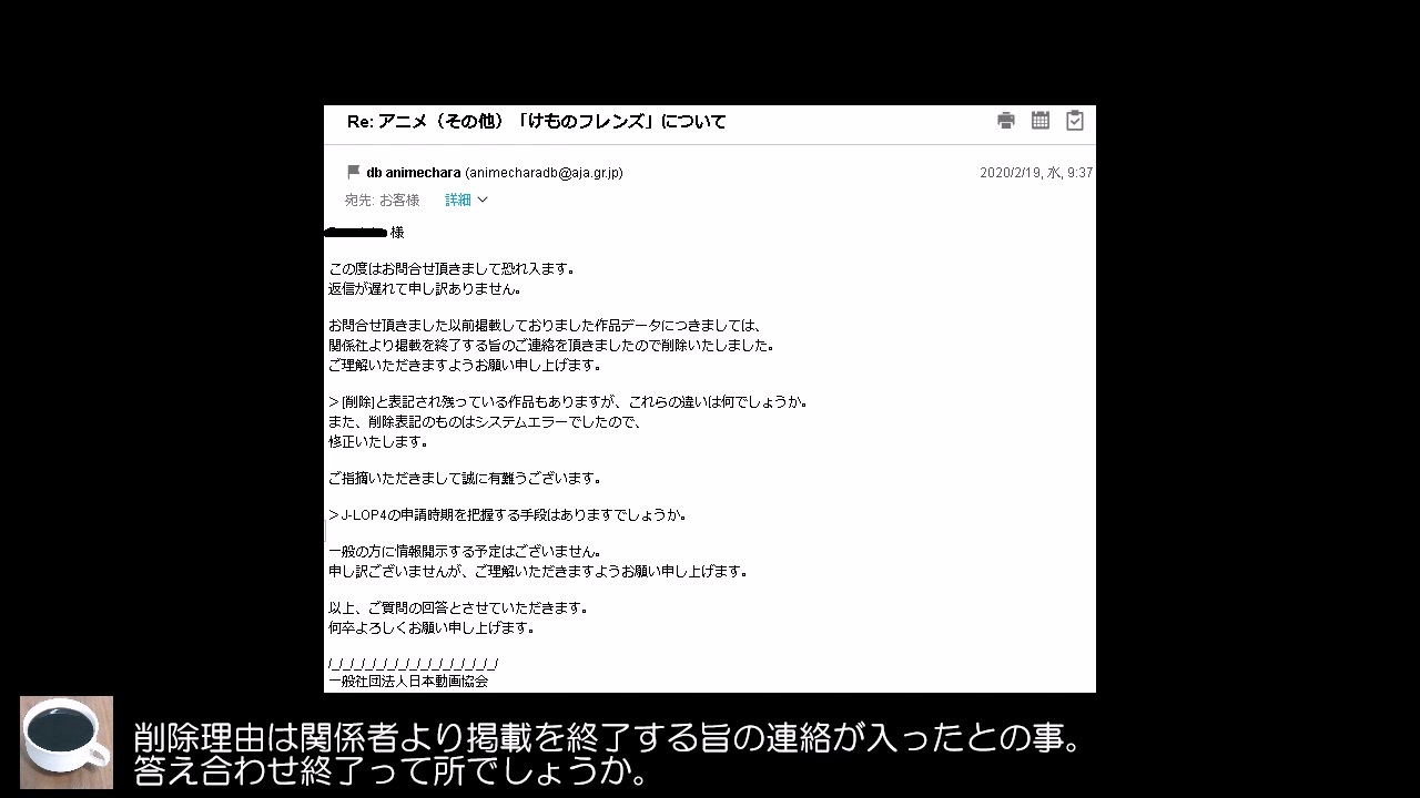 <span style="color: #000000; font-size: 13px;">前回の、コピーライト:ヤオヨロズのページが削除されている動画(</span><a href="https://www.nicovideo.jp/watch/sm36369713" class="watch">sm36369713</a>)に関してお問い合せの返答が来ました。答え合わせ終了っぽい?<br>追記:<span style="color: #14171a; font-size: 15px;">「</span>関係社より掲載終了の連絡<span style="color: #14171a; font-size: 15px;">」なので、KFPAのコピーライトは少なくとも申請時はヤオヨロズになりますね。</span><br><br>けものフレンズ<span style="color: #000000; font-size: 13px;">(アニメ)</span>(日本動画協会)<br><a href="http://animecharadb.jp/content/?id=28300&lang=jp" target="_blank" rel="noopener nofollow">http://animecharadb.jp/content/?id=28300&lang=jp</a><br><br>関連動画まとめたマイリスト:<a href="https://www.nicovideo.jp/mylist/67462831" target="_blank" rel="noopener">mylist/67462831</a><br>ツイッター:<a href="https://twitter.com/kemo2bombot" target="_blank" rel="noopener nofollow">https://twitter.com/kemo2bombot</a>