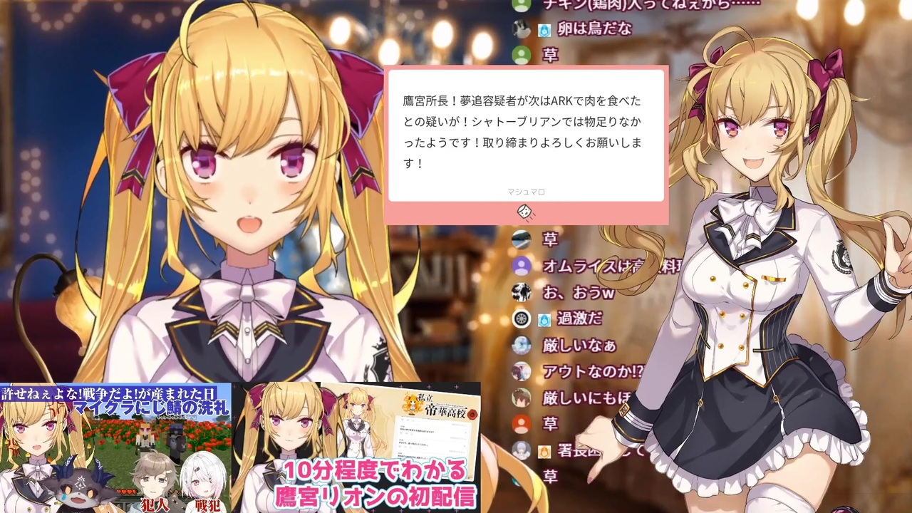 一体いくつ罪を重ねれば気が済むんだいゆめお?<br><br>本家参考動画<br>・鷹宮リオン<br>【新ビジュアル】新ビジュさくっと公開したりとか、名古屋組の話とか、zeppの話とか【にじさんじ/鷹宮リオン】<br><a href="https://youtu.be/DBAkj9jl9m4" target="_blank" rel="noopener nofollow">https://youtu.be/DBAkj9jl9m4</a><br>・夢追翔<br>【ARK: Survival Evolved】まだ人間が食物連鎖の頂点に立っていなかった頃【にじさんじ/夢追翔/社築/加賀美ハヤト】<br><a href="https://youtu.be/P_Dp4PzNQgQ" target="_blank" rel="noopener nofollow">https://youtu.be/P_Dp4PzNQgQ</a><br><br>参考チャンネル<br>・鷹宮リオン<br><a href="https://www.youtube.com/channel/UCV5ZZlLjk5MKGg3L0n0vbzw" target="_blank" rel="noopener nofollow">https://www.youtube.com/channel/UCV5ZZlLjk5MKGg3L0n0vbzw</a><br>・夢追翔<br><a href="https://www.youtube.com/channel/UCTIE7LM5X15NVugV7Krp9Hw" target="_blank" rel="noopener nofollow">https://www.youtube.com/channel/UCTIE7LM5X15NVugV7Krp9Hw</a><br><br>参考元主Twitter<br>・鷹宮リオン<br><a href="https://twitter.com/TakamiyaRion" target="_blank" rel="noopener nofollow">https://twitter.com/TakamiyaRion</a><br>・夢追翔<br><a href="https://twitter.com/kakeru_yumeoi" target="_blank" rel="noopener nofollow">https://twitter.com/kakeru_yumeoi</a><br><br>ニコニコのダイコンマンリスト<br>「バーチャルYouTuberシリーズ」↓<br><a href="https://www.nicovideo.jp/mylist/62551838" target="_blank" rel="noopener">mylist/62551838</a><br><br>YouTubeのダイコンマンチャンネル<br><a href="https://www.youtube.com/channel/UCkpfR11cG2kk9KTJijWCJfg" target="_blank" rel="noopener nofollow">https://www.youtube.com/channel/UCkpfR11cG2kk9KTJijWCJfg</a><br><br>ダイコンマンのTwitter<br><a href="https://twitter.com/Daikon_Man_V" target="_blank" rel="noopener nofollow">https://twitter.com/Daikon_Man_V</a>