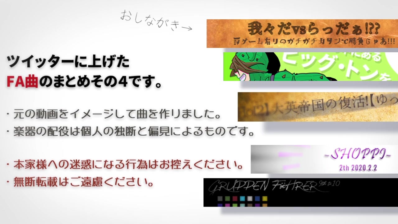 ツイッターに上げていた短いイメージ曲集その4です。全5曲。<br>コラボ動画、単体イメージ、お祝い曲とごった煮になっております。<br><br>おしながきは動画冒頭にて。<br><br>・本家様への迷惑になる行為はお控えください。<br>・無断転載はご遠慮ください。<br><br>(ここからまた色が増えていくんでしょうか。)<br><br>その3:<a href="https://www.nicovideo.jp/watch/sm35815173" class="watch">sm35815173</a>/その5:<a href="https://www.nicovideo.jp/watch/sm37103609" class="watch">sm37103609</a><br>作ったもの:<a href="https://www.nicovideo.jp/mylist/63760456" target="_blank" rel="noopener">mylist/63760456</a>