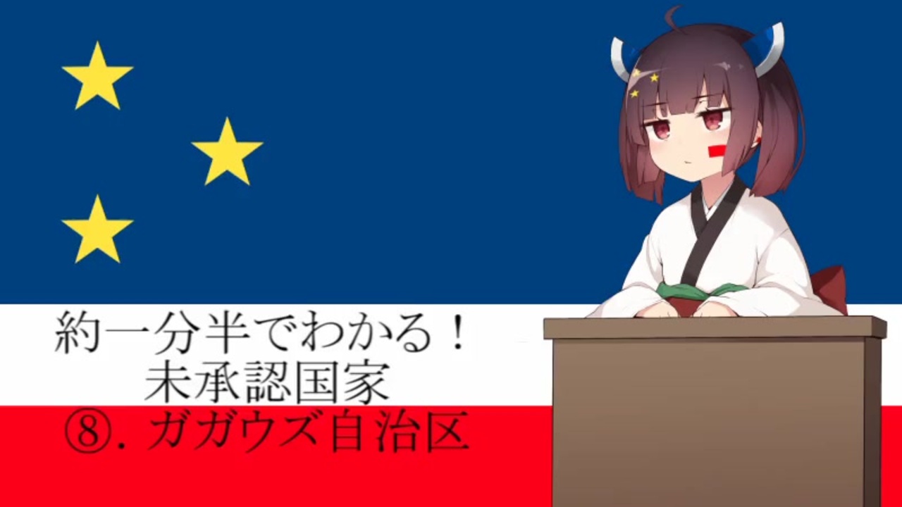 第八弾です。<br>今回はモルドバ共和国内部の自治区、ガガウズ・イェリです。<br>毎回コメントを参考にさせていただいてます。ありがとうございます。<br>私情なんですけど、受験勉強とかしてて投稿遅くなりました。大学受かりました。ありがとうございます。<br>時間を守らないのは時間縛り解説の特権。<br><br><span style="color: #3c78d8;"><s>・</s></span>今までの未承認国家解説のリストです。【 <a href="https://www.nicovideo.jp/series/35395" target="_blank" rel="noopener nofollow">https://www.nicovideo.jp/series/35395</a> 】<br>welcome→<a href="https://twitter.com/cuddle_ghost" target="_blank" rel="noopener nofollow">https://twitter.com/cuddle_ghost</a><br><br><span style="color: #0000ff;"><s>・</s></span>使用させていただいたもの<br>柴又/re様[<a href="https://www.nicovideo.jp/watch/sm32523878" class="watch">sm32523878</a>]<br>きりたん立ち(座り)絵/ふゆき様[<a href="https://seiga.nicovideo.jp/seiga/im8000964" target="_blank" rel="noopener">im8000964</a>]<br>ソビエト連邦国歌[ <a href="https://youtu.be/xSr5ewJvVig" target="_blank" rel="noopener nofollow">https://youtu.be/xSr5ewJvVig</a> ]<br>
