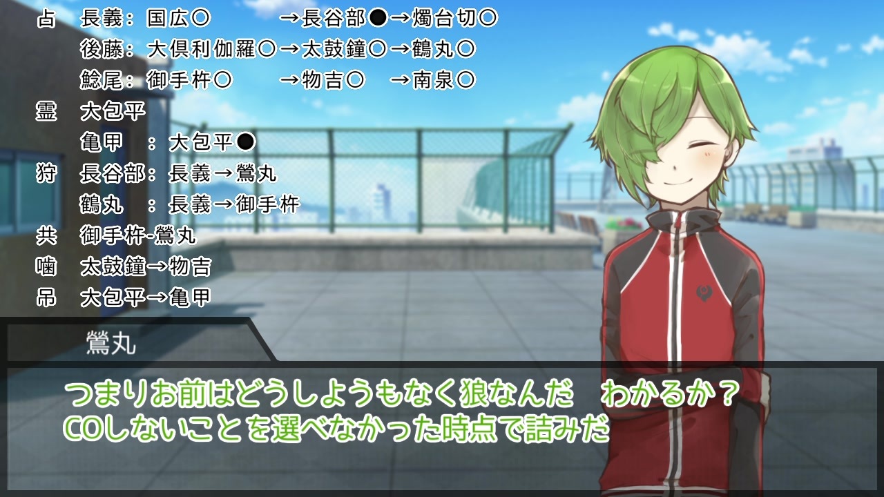 皆の考察回。<br><strong>配役:村5/占1/霊1/狩1/共2/狼3/狂1/狐2</strong><br><br>投稿後6分でバレるクソミス(大変すいません)<br><br><a href="https://www.nicovideo.jp/watch/sm36389373" class="watch">sm36389373</a>←3日目|<a href="https://www.nicovideo.jp/mylist/65368586" target="_blank" rel="noopener">mylist/65368586</a>|<span style="font-size: 16px;">5日目→<a href="https://www.nicovideo.jp/watch/sm36457444" class="watch">sm36457444</a></span><br><br />だてぐみじんろう:<a href="https://www.nicovideo.jp/series/1107" target="_blank" rel="noopener">series/1107</a><br>→考察、感想をTwitterでつぶやくときは<strong>「#だてぐみじんろう」</strong>をどうぞ!私が喜びます。<br>ジョジョ卓:<a href="https://www.nicovideo.jp/series/29049" target="_blank" rel="noopener">series/29049</a><br>ダイマ動画:<a href="https://www.nicovideo.jp/series/29054" target="_blank" rel="noopener">series/29054</a><br>無人島開発:<a href="https://www.nicovideo.jp/series/112224" target="_blank" rel="noopener">series/112224</a><br>解説動画:<a href="https://www.nicovideo.jp/series/179736" target="_blank" rel="noopener">series/179736</a>