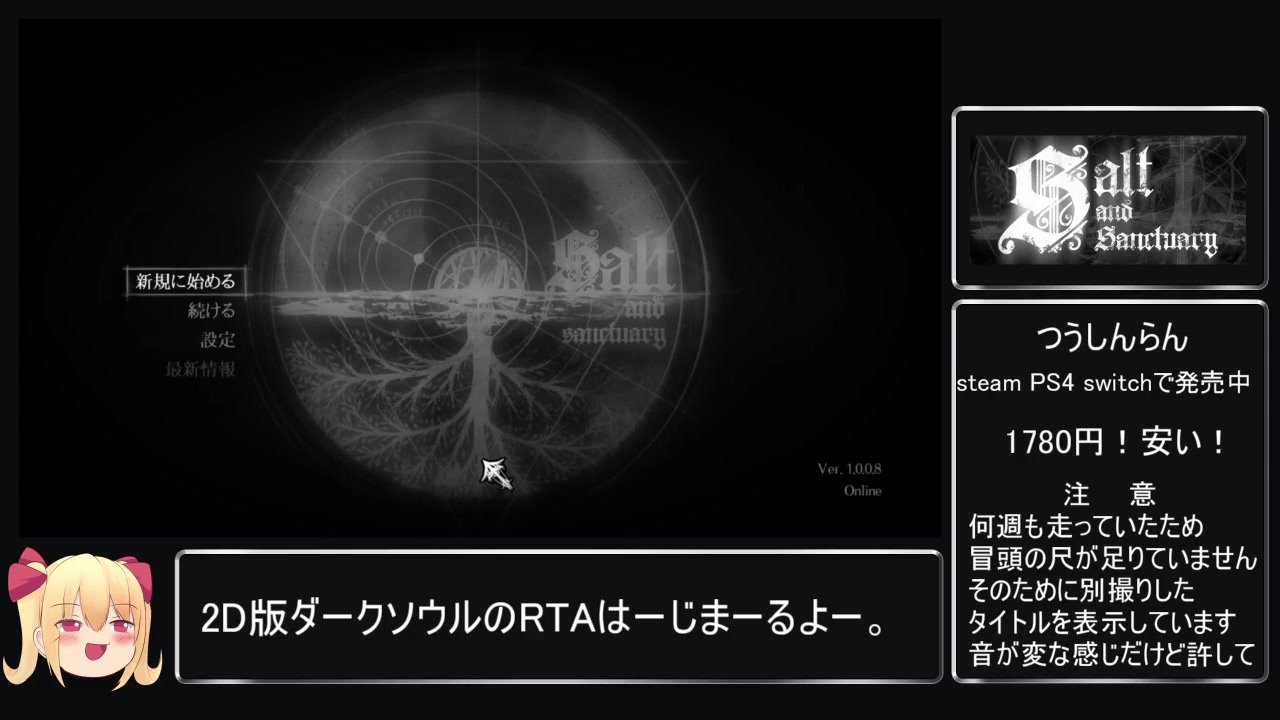 塩を集めて、強くなれ。<br><br>計測開始は色々決めてゲームスタートした時点<br>計測終了は井戸に飛び込んだ地点<br><br>part2→<a href="https://www.nicovideo.jp/watch/sm36440020" class="watch">sm36440020</a><br><br>左下の娘はうちの子、せーらちゃん様です。<br>赤羽あおりさんにゆっくり化してもらいました。<br><br><span style="color: #000000; font-size: 14px;">ゲームの購入はこちらから↓</span><br><a href="https://store.steampowered.com/app/283640/Salt_and_Sanctuary/" target="_blank" rel="noopener nofollow">https://store.steampowered.com/app/283640/Salt_and_Sanctuary/</a><br><br><br />RTAの動画リスト<br><a href="https://www.nicovideo.jp/mylist/63232443" target="_blank" rel="noopener nofollow">https://www.nicovideo.jp/mylist/63232443</a><br>宣伝欄<br><br>youtube再開しました<br><a href="https://www.youtube.com/channel/UCaSypo_WcwLLGT1656nod4A" target="_blank" rel="noopener nofollow">https://www.youtube.com/channel/UCaSypo_WcwLLGT1656nod4A</a><br><br><br>背戸山葵と言う名義で小説書いたりつべで配信したりしています<br>作品はR18なので注意<br>Twitter↓<br><a href="https://twitter.com/sedowasabi" target="_blank" rel="noopener nofollow">https://twitter.com/sedowasabi</a><br>