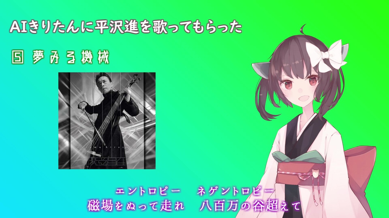 今話題のAIきりたんに平沢進の曲を何曲か歌ってもらいました。<br><br>Q. AIきりたんって何? A. SHACHI氏が製作され、今年の2月22日に公開された歌声シンセサイザー「NEUTRINO」(フリーウェア)で使える東北きりたんの歌声ライブラリです。詳しくはニコニコ大百科もしくは→<a href="https://suzusime-log.hatenablog.jp/entry/2020/02/22/180306" target="_blank" rel="noopener nofollow">https://suzusime-log.hatenablog.jp/entry/2020/02/22/180306</a><br><br>ΤεΛτΑ(てるた)です。普段は平沢進の打ち込みカバーを作り鏡音レンなどのVOCALOIDに歌わせているのですが、きりたんがスーパーシンガーになってやってきたと聞いて夜も寝ずにAIきりたんにヒラサワカバーを歌わせようと格闘していました。<br>AIきりたん素晴らしい… 初めのうちは色々と打ち込みの方法が難しくて???状態だったのですが、3日目の今日になってようやく使い方が分かるようになってきました。音声を合成する前の段階での調整をめっちゃ頑張った。ピッチ調整はしてません。<br><br>オケは自作です。既に鏡音レンでカバーした既存のものですが、そのまま流用するのもつまらないので全部の曲にシンセサイザーを足しています。また、ちょこちょこレンが歌ったりします。今度デュエットさせたいな… この動画で歌わせた曲はショートバージョンですが、もしフルバージョンを聴きたいとか(平沢進の)○○の曲歌わせてくれとかリクエストがあればお気軽にコメントしてください。<br><br>追記:予想を異常に上回る伸びでビビるわぁ… リクエスト曲はなるべく全部作りたいと思ってますがなにせ数が多いので、できる限りのスピードで消化していきます。あと、間違えてないか?私は平沢進のカバーを作っているだけだぞ。平沢唯じゃない。<br><br>Timeline→<a href="https://www.nicovideo.jp/watch/sm36526761" class="watch">sm36526761</a><br>RIDE THE→<a href="https://www.nicovideo.jp/watch/sm36558136" class="watch">sm36558136</a><br>上空初期値→<a href="https://www.nicovideo.jp/watch/sm36576890" class="watch">sm36576890</a><br>バンディリア→<a href="https://www.nicovideo.jp/watch/sm36464234" class="watch">sm36464234</a><br>夢みる機械→<a href="https://www.nicovideo.jp/watch/sm36434676" class="watch">sm36434676</a><br><br><br>この動画で使用したもの、お借りしたもの:<br>東北きりたん立ち絵… 桧野拓海様(<a href="https://seiga.nicovideo.jp/seiga/im10124481" target="_blank" rel="noopener">im10124481</a>)<br>ボーカル… NEUTRINO 東北きりたん、VOICEROID+ 東北きりたんEX、鏡音レンV4X<br>オケ… KORG Gadget 2、KORG minilogue<br><br>作った人… ΤεΛτΑ(てるた) マイリスト:<a href="https://www.nicovideo.jp/mylist/60048107" target="_blank" rel="noopener">mylist/60048107</a> Twitter:@Teltaizm<br><br>広告、コメント、マイリス等ありがとうございます!!<br>初めて10000再生突破しました…感謝です<br><br>おや…? こんなところにも馬骨AIきりたんが…:<a href="https://www.nicovideo.jp/watch/sm36450659" class="watch">sm36450659</a>