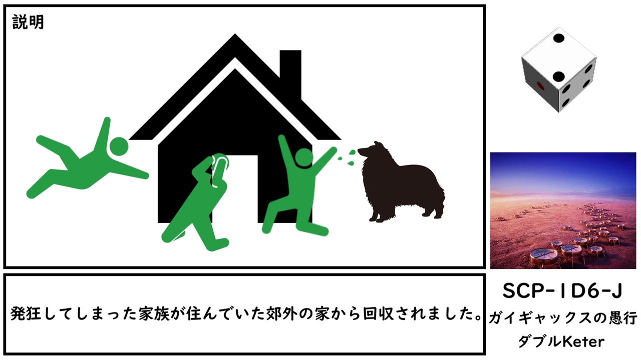 ダイスロール!!!<br><br>本家記事 <a href="http://www.scp-wiki.net/scp-1d6-j" target="_blank" rel="noopener nofollow">http://www.scp-wiki.net/scp-1d6-j</a><br>翻訳記事 <a href="http://ja.scp-wiki.net/scp-1d6-j" target="_blank" rel="noopener nofollow">http://ja.scp-wiki.net/scp-1d6-j</a><br>作者 zaratustra<br>SCP財団 <a href="http://ja.scp-wiki.net" target="_blank" rel="noopener nofollow">http://ja.scp-wiki.net</a><br><span style="color: #000000; font-size: 14px;">過去の動画はこちら </span><span style="color: #006699; font-size: 14px;"><a href="https://www.nicovideo.jp/mylist/67620202" target="_blank" rel="noopener">mylist/67620202</a></span><br>CC-BY-SA 3.0