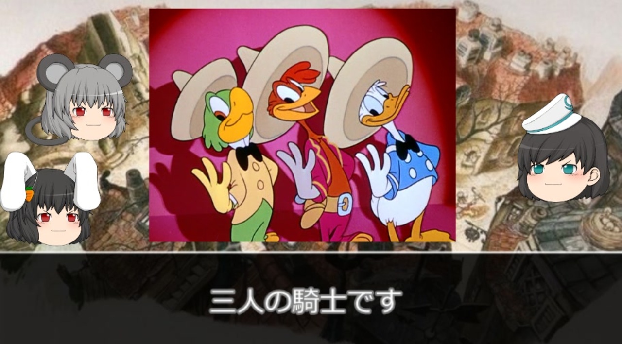 ※御無沙汰しております<br><br>今回のテーマはラテン・アメリカの旅 と 三人の騎士です。<br><br>ほぼ半年振りの投稿です。流石にうp主失踪シリーズタグがつくのではないかと戦々恐々としておりましたが、そんなこともなく投稿にこぎつけることができました。<s>普段から投稿ペースが遅いのが活きましたね。</s><br>投稿していない期間、過去作を広告してくださった皆様、本当にありがとうございます。<br><br>動画時間、40分越えは死守しました。<br>他のゆっくり解説動画さんで<strong>「動画時間は15分程度が丁度良い」</strong>というコメントを見かけましたが、<span style="color: #ff0000;"><strong>本当にその通りだと思います。</strong></span>もうこれ以上長くなることは無い・・・と約束したな、アレは嘘だ<a href="https://www.nicovideo.jp/watch/sm40256315" class="watch">sm40256315</a><br><br>今回は、次回の内容を鑑みて、思いついたネタとりあえず入れてみました。結構カオスになってます。<span style="font-size: 10px;">取り上げてる作品のほうがよっぽどカオスじだし、問題ないよね。</span><br><br>参考文献が1冊抜けていました↓<br>ウォルト・ディズニー -冒険と創造の生涯- 著:ボブ・トマス<br><br>動画で触れた三人の騎士サントラはこちらから <a href="https://www.nicovideo.jp/watch/sm32065892" class="watch">sm32065892</a> <a href="https://www.nicovideo.jp/watch/sm31378301" class="watch">sm31378301</a><br><br>※この動画は、Amazonプライム・ビデオで配信されていた『有田と週刊プロレスと』をリスペクトしています。<br><br>シリーズマイリス<a href="https://www.nicovideo.jp/mylist/60142128" target="_blank" rel="noopener">mylist/60142128</a> 扱ったアニメ<a href="https://www.nicovideo.jp/mylist/60142169" target="_blank" rel="noopener">mylist/60142169</a><br>派生シリーズ<a href="https://www.nicovideo.jp/mylist/65845573" target="_blank" rel="noopener">mylist/65845573</a> <a href="https://www.nicovideo.jp/mylist/68298363" target="_blank" rel="noopener">mylist/68298363</a><br><br>動画投稿・進捗報告などをするためにTwitter始めました。<br><a href="https://twitter.com/DuckheadW" target="_blank" rel="noopener nofollow">https://twitter.com/DuckheadW</a><br><br><a href="https://www.nicovideo.jp/watch/sm35658888" class="watch">sm35658888</a>←前(グーフィー) ここ【ラテン・アメリカの旅 / 三人の騎士】 次→(<a href="https://www.nicovideo.jp/watch/sm36452242" class="watch">sm36452242</a>)