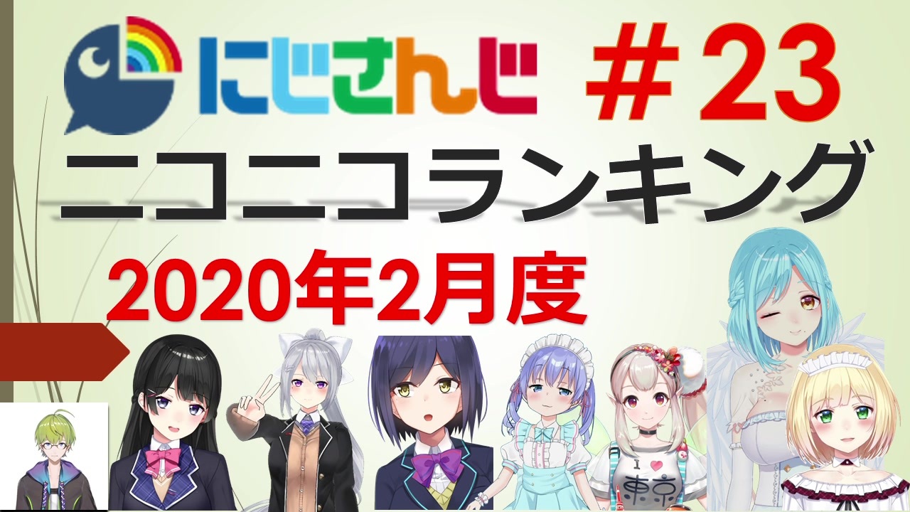 ■集計期間:2020年<span style="color: #ff0000; font-size: 18px;">2月1日</span><span style="color: #262626; font-size: 13px;">0時</span><span style="color: #262626; font-size: 16px;">~</span><span style="color: #ff0000; font-size: 18px;">2月29日</span><span style="font-size: 13px;">24時</span><br>■集計方法:再生数+(コメント数×補正値)+(マイリスト登録数×<span style="color: #ff0000;">25</span><span style="color: #262626;">)</span><br>■集計対象:タグ 「にじさんじ」がついている動画<br>──────<br>プレイリスト:<a href="https://www.nicovideo.jp/mylist/67731701" target="_blank" rel="noopener">mylist/67731701</a><br>──────<br><span style="color: #000000; font-size: 13px;">#22(1月度):</span><a href="https://www.nicovideo.jp/watch/sm36323724" class="watch">sm36323724</a><span style="color: #000000; font-size: 13px;"> |#23(2月度):いまここ |<br>#24(3月度):4月上旬|<br>年間ランキング#02:</span><a href="https://www.nicovideo.jp/watch/sm36193306" class="watch">sm36193306</a><br>──────<span style="color: #000000; font-size: 13px;"> </span><br><br>2020年2月度のランキングです。<br>このランキングでは<span style="color: #ff0000;"><u>「にじさんじ」のタグが付いている動画のみ</u></span><span style="color: #ff0000;">が集計対象となっています</span>。