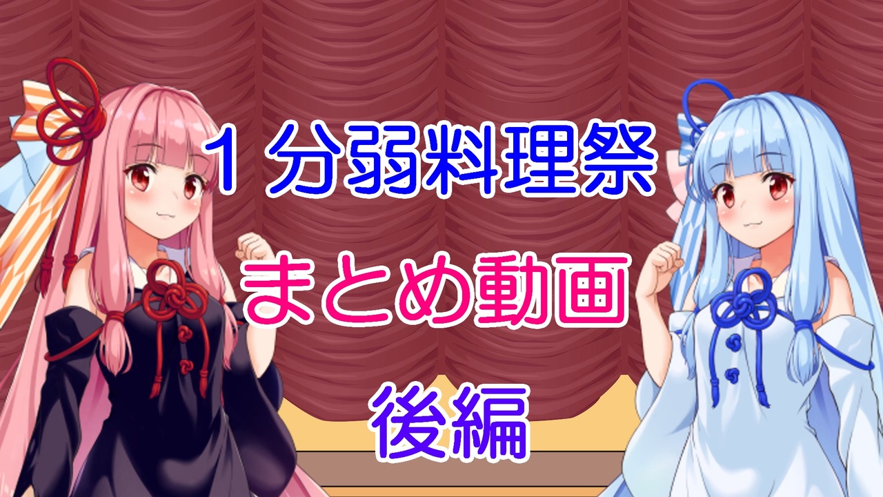 かなりお待たせしてしまってすみません。<br>やっと後編が出来上がりましたので投稿いたします。<br><br>これにて私の1分弱料理祭は本当に終わります。<br>楽しいお祭に参加できただけでなく、こんな大役を仰せつかり、本当に光栄の極みでした。<br>また第2回、3回と開催されるときにはぜひ、参加させていただきたいです(*´ω`*)<br><br><strong>みなさま、お疲れさまでした!!!</strong><br><br>今回紹介させていただきました動画はコンテンツツリーに載せさせていただきます。<br><br><span style="font-size: 14px;">素材をお借りした方々、ありがとうございます。<br>そして、視聴いただいたあなたに最大の感謝を。</span><br><br><strong>【参加させていただいた素敵企画】<br>1分弱料理祭(告知動画):</strong><span style="color: #006699;"><strong><a href="https://www.nicovideo.jp/watch/sm36306021" class="watch">sm36306021</a></strong></span><br><strong>主催:りょの字様 </strong><span style="color: #006699;"><strong><a href="https://twitter.com/ryo_no_ji" target="_blank" rel="noopener nofollow">https://twitter.com/ryo_no_ji</a></strong></span><br><br>まとめ動画で紹介させていただいた動画リスト:<a href="https://www.nicovideo.jp/mylist/67682279" target="_blank" rel="noopener nofollow">https://www.nicovideo.jp/mylist/67682279</a><br><br><span style="font-size: 14px;">前:</span><span style="font-size: 13px;">1分弱料理祭(前編)【</span><a href="https://www.nicovideo.jp/watch/sm36441799" class="watch">sm36441799</a><span style="font-size: 13px;">】</span><br><span style="font-size: 14px;">次:シャービック【</span><a href="https://www.nicovideo.jp/watch/sm36661688" class="watch">sm36661688</a><span style="font-size: 14px;">】</span><br><br><br>更新情報などはTwitterを見てください。<br>【<span style="color: #006699;"><a href="https://twitter.com/yosugacafe_" target="_blank" rel="noopener nofollow">https://twitter.com/yosugacafe_</a></span> 】