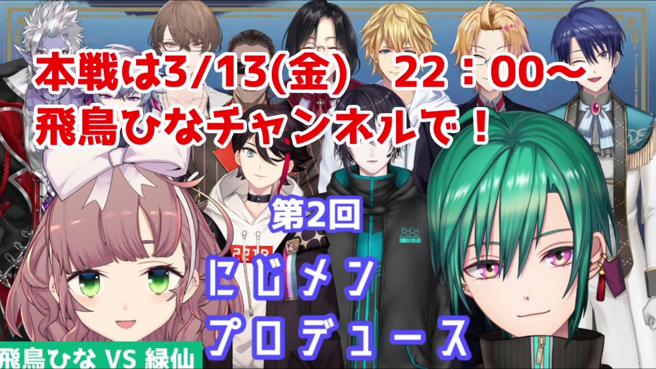 あの配信が再び行なわれると聞いて<br>この動画では出演する男性ライバーを一部紹介してます(全て見たい方はアーカイブで!)<br><br>アーカイブ:<a href="https://www.youtube.com/watch?v=5Eq5hE4DMSI" target="_blank" rel="noopener nofollow">https://www.youtube.com/watch?v=5Eq5hE4DMSI</a><br><br>第1回はこちら→<a href="https://www.youtube.com/watch?v=vObC6O4ZkxQ" target="_blank" rel="noopener nofollow">https://www.youtube.com/watch?v=vObC6O4ZkxQ</a><br><br>緑仙:<a href="https://www.youtube.com/channel/UCt5-0i4AVHXaWJrL8Wql3mw" target="_blank" rel="noopener nofollow">https://www.youtube.com/channel/UCt5-0i4AVHXaWJrL8Wql3mw</a><br>飛鳥ひな:<a href="https://www.youtube.com/channel/UCiSRx1a2k-0tOg-fs6gAolQ" target="_blank" rel="noopener nofollow">https://www.youtube.com/channel/UCiSRx1a2k-0tOg-fs6gAolQ</a><br><br><span style="font-size: 18px;"><strong>本戦は飛鳥ひなチャンネルにて 3/13(金)22:00~!!</strong></span><br><strong>URL:</strong><a href="https://www.youtube.com/watch?v=3N7hy8oCYtA" target="_blank" rel="noopener nofollow">https://www.youtube.com/watch?v=3N7hy8oCYtA</a>