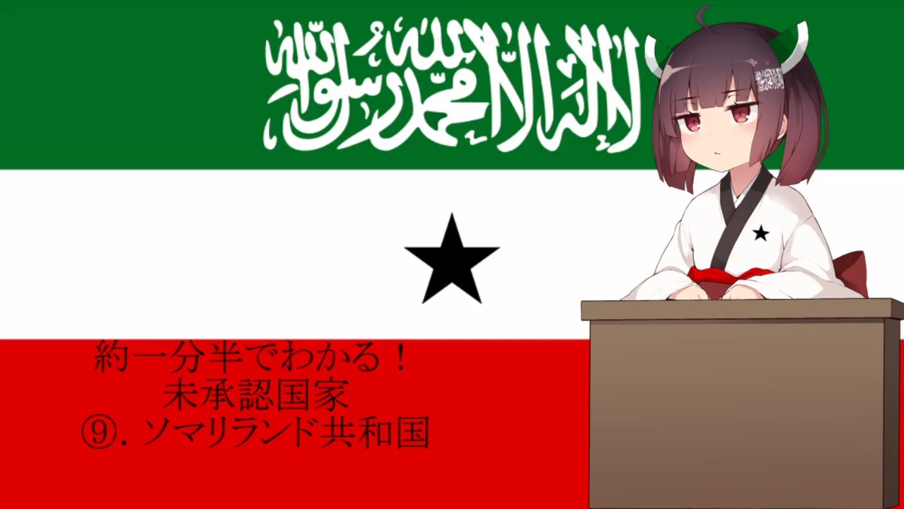 第九弾です。<br>動画サイズ変えました。<br>今回は<span style="color: #b7b7b7;"><s>地球海賊</s></span>ソマリランド共和国です。比較的有名かなと思います。<br>毎回コメントとかマイリスとかしていただいてありがとうございます。<br>広告とかありがたいです。ベリーベリー感謝。<br>一万再生も毎回嬉しいです。<br><br>・今までの未承認国家解説のリストです。【 <a href="https://www.nicovideo.jp/series/35395" target="_blank" rel="noopener nofollow">https://www.nicovideo.jp/series/35395</a> 】<br>welcome→<a href="https://twitter.com/cuddle_ghost" target="_blank" rel="noopener nofollow">https://twitter.com/cuddle_ghost</a><br><br>・使用させていただいたもの<br>柴又/re様[<a href="https://www.nicovideo.jp/watch/sm32523878" class="watch">sm32523878</a>]<br>きりたん立ち(座り)絵/ふゆき様[<a href="https://seiga.nicovideo.jp/seiga/im8000964" target="_blank" rel="noopener">im8000964</a>]