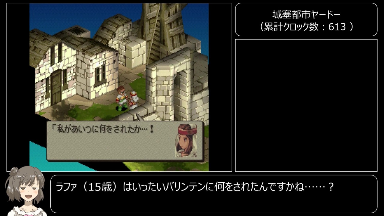 PS版FFTのシナリオを最小クロックでクリアするTAS動画です。<br>合成音声による解説がありますので、苦手な方はご注意ください。<br>プレイ条件の詳細については、Chapter1-1(<a href="https://www.nicovideo.jp/watch/sm35981364" class="watch">sm35981364</a>)、およびChapter2-3(<a href="https://www.nicovideo.jp/watch/sm36306443" class="watch">sm36306443</a>)の動画末尾で補足しています。<br><br><span style="font-size: 13px;">【プレイ条件】</span><br>1. シナリオ順に戦闘を最小クロックでクリア(勝利条件を満たしたクロックまでカウント)<br>2. 移動日数の最小化(アイテム購入目的の移動は可能)<br>3. メモリーカードからのデータロード禁止<br>4. バグの利用禁止(詳細はChapter2-3の動画末尾で補足)<br><br><span style="font-size: 13px;">【プレイ環境】</span><br>エミュレータ: BizHawk 2.3.1<br>最終キー入力: 1053399 F(4:56:06)<br>追記回数: 53912+<br><br><a href="https://www.nicovideo.jp/watch/sm36425659" class="watch">sm36425659</a> < 前:次 > <a href="https://www.nicovideo.jp/watch/sm36574956" class="watch">sm36574956</a><br><span style="color: #000000; font-size: 13px;">クリティカルヒットについて:</span><a href="https://www.nicovideo.jp/watch/sm36058415" class="watch">sm36058415</a><br>マイリスト:<a href="https://www.nicovideo.jp/mylist/66955206" target="_blank" rel="noopener">mylist/66955206</a><br><span style="color: #000000; font-size: 13px;">進捗報告:<a href="https://twitter.com/spherewind1" target="_blank" rel="noopener nofollow">https://twitter.com/spherewind1</a></span><br><br>※追記※ 14分あたりの台詞 ×天鼓雷音 〇阿修羅