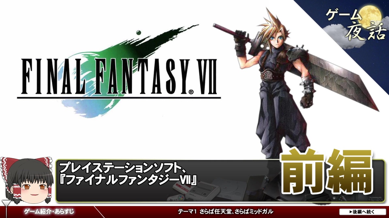 過去動画を宣伝して下さった皆さん、ありがとうございましたm(__)m<br>毎回ひとつのゲームを取り上げ、3つのテーマから解説&考察します。<br>【前編】は毎月1日・15日更新、【後編】は制作状況に応じて更新致します。<br><br><span style="color: #030303; font-size: 14px;">【</span><span style="color: #030303; font-size: 14px;"><strong>補足になります】</strong></span><br><strong>動画内でお話したことに説明不足な点がありましたm(__)m<br>Nintendo 64でベヒーモスのテストをしたという話は、北瀬さんが証言していました。<br><br>坂口さんは、限られた容量のNintendo 64カートリッジでは、3DのRPG(FF7はCD-ROM3枚組)を作るのは容量的に不可能だったと語っています。メモリも問題のひとつとして挙げています。<br><br>▼参考にしたサイトはこちらです。<br>かなり長いですが、詳しい証言がまとめられています。</strong><br><a href="https://www.polygon.com/a/final-fantasy-7" target="_blank" rel="noopener nofollow">https://www.polygon.com/a/final-fantasy-7</a><br><br>■中編:<a href="https://www.nicovideo.jp/watch/sm36548832" class="watch">sm36548832</a><br>■後編:<a href="https://www.nicovideo.jp/watch/sm36569558" class="watch">sm36569558</a><br><br>■youtubeはこちら <a href="https://youtu.be/b2i1U2dJRtI" target="_blank" rel="noopener nofollow">https://youtu.be/b2i1U2dJRtI</a><br>■告知用のツイッター <a href="https://twitter.com/gameyawa" target="_blank" rel="noopener nofollow">https://twitter.com/gameyawa</a><br><br><span style="color: #000000; font-size: 13px;">■第71回「ワンダープロジェクトJ 機械の少年ピーノ」</span><a href="https://www.nicovideo.jp/watch/sm36443184" class="watch">sm36443184</a><span style="color: #000000; font-size: 13px;">(前編)</span><a href="https://www.nicovideo.jp/watch/sm36478654" class="watch">sm36478654</a><span style="color: #000000; font-size: 13px;">(後編) <br>■第73回「</span>スーパーマリオ64」前編:<a href="https://www.nicovideo.jp/watch/sm36610547" class="watch">sm36610547</a> 中編:<a href="https://www.nicovideo.jp/watch/sm36654020" class="watch">sm36654020</a> 後編:<a href="https://www.nicovideo.jp/watch/sm36659517" class="watch">sm36659517</a><br><br>■ゲーム夜話マイリスト <a href="https://www.nicovideo.jp/mylist/56973971" target="_blank" rel="noopener">mylist/56973971</a><br><span style="color: #000000; font-size: 13px;">■ゲーム夜話特別編マイリスト <a href="https://www.nicovideo.jp/mylist/65104419" target="_blank" rel="noopener">mylist/65104419</a></span>