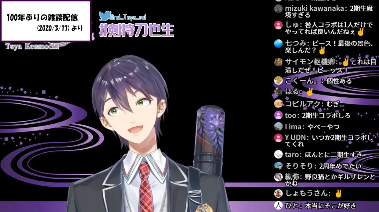 水(<a href="#" class="seekTime" data-seekTime="00:38" onclick="seekNicoPlayer('#00:38'); return false;">#00:38</a>)<br>・剣持刀也<br>【Youtube】<a href="https://www.youtube.com/channel/UCv1fFr156jc65EMiLbaLImw?sub_confirmation=1" target="_blank" rel="noopener nofollow">https://www.youtube.com/channel/UCv1fFr156jc65EMiLbaLImw?sub_confirmation=1</a><br>【Twitter】 <a href="https://twitter.com/rei_Toya_rei" target="_blank" rel="noopener nofollow">https://twitter.com/rei_Toya_rei</a><br><br>▼元動画<br>100年ぶりの雑談配信(2020/3/17)<br><a href="https://www.youtube.com/watch?v=l0yBj_5Ahr8" target="_blank" rel="noopener nofollow">https://www.youtube.com/watch?v=l0yBj_5Ahr8</a><br>▼該当箇所(38:42~)<br><a href="https://www.youtube.com/watch?v=l0yBj_5Ahr8&feature=youtu.be&t=2322" target="_blank" rel="noopener nofollow">https://www.youtube.com/watch?v=l0yBj_5Ahr8&feature=youtu.be&t=2322</a>