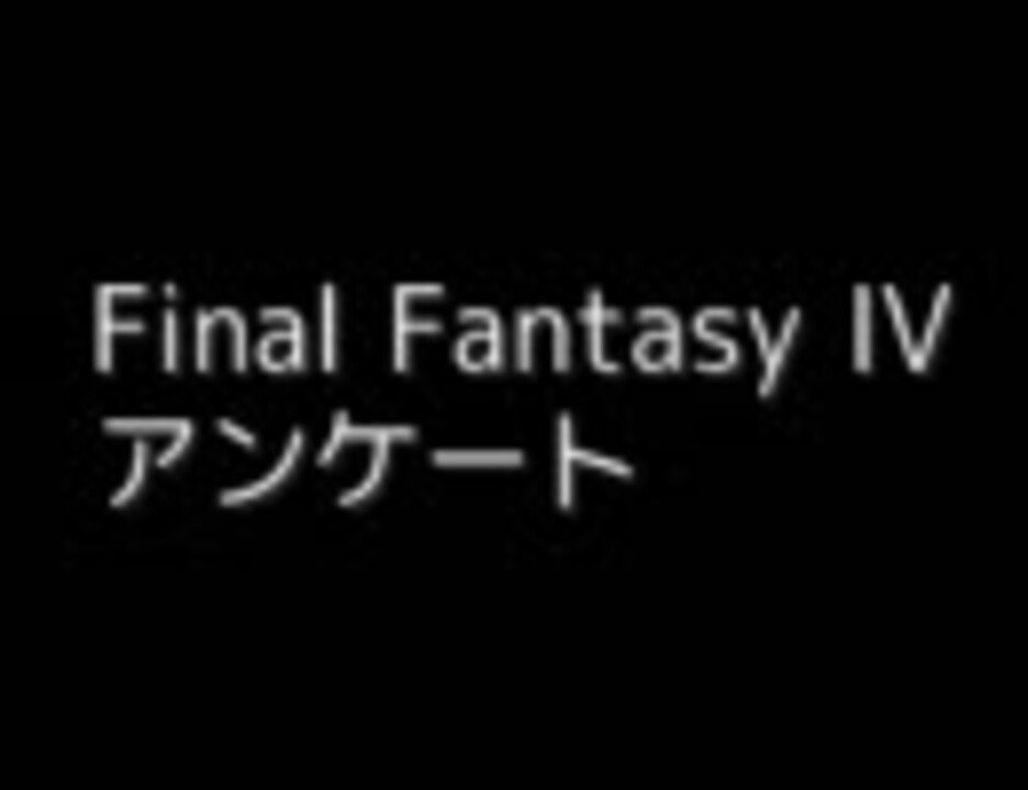 <a href="https://www.nicovideo.jp/watch/sm438659" class="watch">sm438659</a>を見て、FF4のアンケート動画が無いことに気付き(あったらすみません)、自分でも作ってみました。恣意的な内容の質問もあるので、気を悪くされたらごめんなさい。続編作りました(Part2は<a href="https://www.nicovideo.jp/watch/sm3661809" class="watch">sm3661809</a>、Part3は<a href="https://www.nicovideo.jp/watch/sm3668712" class="watch">sm3668712</a>) →FF3アンケートは<a href="https://www.nicovideo.jp/watch/sm4720249" class="watch">sm4720249</a> →FF5アンケートは<a href="https://www.nicovideo.jp/watch/sm3689019" class="watch">sm3689019</a> →他の拙作は <a href="https://www.nicovideo.jp/mylist/6854536" target="_blank" rel="noopener">mylist/6854536</a>