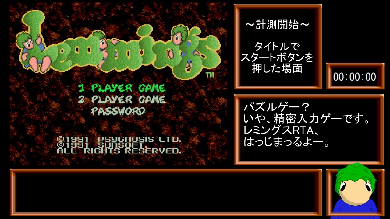 登山界隈から本家RTAに殴り込んだので初投稿です。<br><br>~レギュレーション~<br>計測開始:タイトルでスタートボタンを押しから<br>計測終了:エンディングでレミングが電気を消し暗転まで<br><br>努力義務として「画面内に1匹以上の"作業員"または"ゴールするレミング"を入れておくこと」。<br><br><br><span style="color: #000000;">1時間30分割れを目標にしてたら、うっかり達成しちゃったので投稿です。</span><br>初めてゲームRTA動画なんて作るんだけど、こんなんで大丈夫かな?<br>まぁ、わりとガバガバなんでほんわかご覧ください。<br><br><span style="color: #000000;">たたき台の作品であり、更新されればとても嬉しいです。</span><br><br>次回PART2:<a href="https://www.nicovideo.jp/watch/sm36587516" class="watch">sm36587516</a> <span style="color: #000000;">レミングスマイリスト</span><span style="color: #006699;"><a href="https://www.nicovideo.jp/mylist/35123827" target="_blank" rel="noopener">mylist/35123827</a></span>
