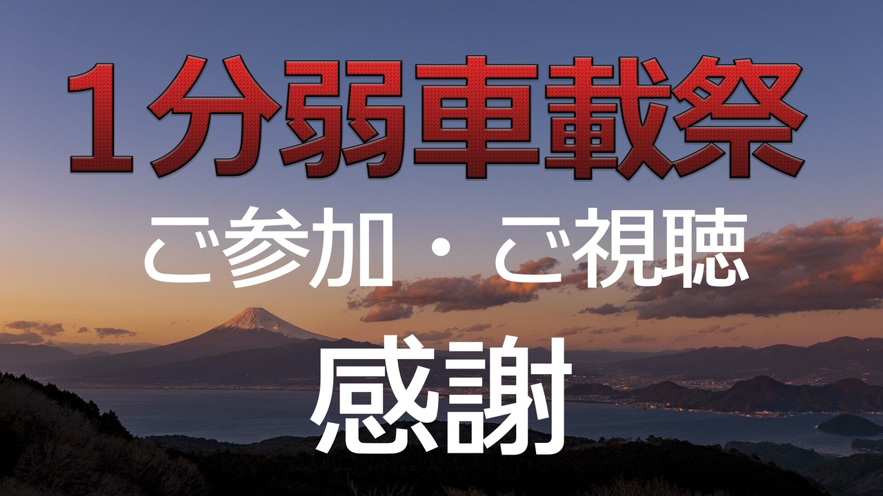 1分弱車載祭、終了です。皆様本当にたくさんの投稿ありがとうございました。<br>全ての動画載せきれませんでした...。皆良い動画作りすぎです!(褒<br>個人的にチョイスし簡素ですがこれで本企画のエンドロールとさせてください。<br>※お借りした動画はコンテンツツリーに紐付けします(作業完了)<br>後夜祭に関してはご批判頂き主催としては案内予定ないです。<br>まだ/今からでも投稿したいという方は波があるうちにしてみてはいかがでしょうか。<br>その気持ちを止める権利のある人はいないのですから。<br>ちなみに「マイリストコメント昇順」にすると序盤に初投稿勢が出てきます。<br>あと最後に総再生時間(昨日0時時点)を示しましたが、ほんの数時間前に(6)1分弱<br>車載が来たので少し増えております。まぁ誤差だし、問題ないね!<br><br>■告知動画 <span style="color: #000000; font-size: 13px;">:</span><a href="https://www.nicovideo.jp/watch/sm36442023" class="watch">sm36442023</a><br>■関連大百科<br>・<span style="color: #000000; font-size: 13px;">1分弱車載祭 :</span><a href="https://dic.nicovideo.jp/id/5584357" target="_blank" rel="noopener nofollow">https://dic.nicovideo.jp/id/5584357</a> <br><span style="color: #000000; font-size: 13px;">・1分弱車載前夜祭:</span><a href="https://dic.nicovideo.jp/id/5584138" target="_blank" rel="noopener nofollow">https://dic.nicovideo.jp/id/5584138</a><span style="color: #000000; font-size: 13px;"> </span><br>■投稿された動画まとめ<br>『1分弱車載祭 』投稿動画: <a href="https://www.nicovideo.jp/mylist/67727434" target="_blank" rel="noopener">mylist/67727434</a> (期間中投稿全記載済/期間外のは入れるだけ)<br>『1分弱車載前夜祭』投稿動画: <a href="https://www.nicovideo.jp/mylist/67669547" target="_blank" rel="noopener">mylist/67669547</a> <span style="color: #000000; font-size: 13px;">(全記載済)<br>■主催より挨拶及びお詫び</span><br><a href="https://twitter.com/goracax/status/1242466450146803712" target="_blank" rel="noopener nofollow">https://twitter.com/goracax/status/1242466450146803712</a><br>■togetter(本祭まとめ)<br>・初日レポ <a href="https://togetter.com/li/1481570" target="_blank" rel="noopener nofollow">https://togetter.com/li/1481570</a><br>・オススメ動画まとめ(未完) <a href="https://togetter.com/li/1483941" target="_blank" rel="noopener nofollow">https://togetter.com/li/1483941</a><br>■1分弱の元ネタ「あかりの1分弱クッキング(#1)」: <a href="https://www.nicovideo.jp/watch/sm35685308" class="watch">sm35685308</a><br>■主催連絡先<br>@goracax(Twitter)<br><a href="https://twitter.com/goracax" target="_blank" rel="noopener nofollow">https://twitter.com/goracax</a><br>