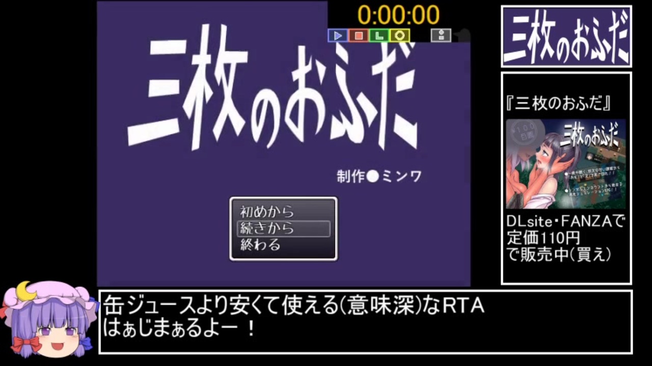 初RTAです。<br><br>三枚のおふだ<br>DLsite <a href="https://www.dlsite.com/maniax/work/=/product_id/RJ199731/" target="_blank" rel="noopener nofollow">https://www.dlsite.com/maniax/work/=/product_id/RJ199731/</a><br>FANZA <a href="https://www.dmm.co.jp/dc/doujin/-/detail/=/cid=d_112422/?i3_ref=search&i3_ord=2" target="_blank" rel="noopener nofollow">https://www.dmm.co.jp/dc/doujin/-/detail/=/cid=d_112422/?i3_ref=search&i3_ord=2</a><br><br>ミンワ様のci-en<span style="color: #000000; font-size: 14px;">ページ <a href="https://ci-en.dlsite.com/creator/1517" target="_blank" rel="noopener nofollow">https://ci-en.dlsite.com/creator/1517</a></span><br><br>新作<span style="color: #333333; font-size: 20px;"><strong>三枚のおふだ 鼎 コドクの妖己 発売中!!</strong></span><br>買おうね!→<a href="https://www.dlsite.com/maniax/work/=/product_id/RJ272137/" target="_blank" rel="noopener nofollow">https://www.dlsite.com/maniax/work/=/product_id/RJ272137/</a><br><br><br>トーカ様 ジョン・スミス様 CV様 こころざし様 暇そうな人様 yuki様 ばす様 もうす様 けんた様<br>はまでら様 戦いは数だよ様 moon of red様 野良デーモン様 かいきゅん様 アストラ様 ロウ様<br>金のアルデオ様 蔓性植物様 blim様 なちょ様 murasame様 <a href="https://www.nicovideo.jp/watch/cd5" class="watch">cd5</a>様 ヴワル魔法図書館の司書様<br><span style="font-size: 14px;">わっきー様 </span>nikuou様 蒼月様 姉妹愛様 younkf様 たしなみ様 蓬莱山輝夜の中の人様 Mullick様 uho3様<br><span style="font-size: 14px;">ムエド様 </span>チョコ様 preshi様 yoppy31様 <span style="font-size: 14px;">munehira様 mu-cho様 名無し様 kA/zU/nA様 フレイン様</span><br>↑広告ありがとうございます!<br><br>次回→<a href="https://www.nicovideo.jp/watch/sm36590032" class="watch">sm36590032</a><br>マイリスト→<a href="https://www.nicovideo.jp/mylist/67932837" target="_blank" rel="noopener">mylist/67932837</a><br><br>合わせて見ると楽しいかもしれない無慈悲版→<a href="https://www.nicovideo.jp/watch/sm36623936" class="watch">sm36623936</a>