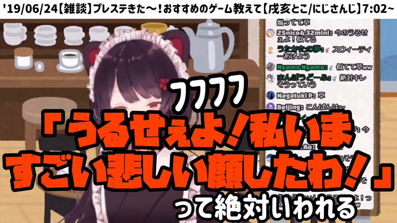 '19/06/24配信より<br><br>▼切り抜き元<br>【雑談】プレステきた~!おすすめのゲーム教えて【戌亥とこ/にじさんじ】<br><a href="https://youtu.be/rtYRkLc1qfo" target="_blank" rel="noopener nofollow">https://youtu.be/rtYRkLc1qfo</a><br /><br>※当動画をYouTubeへ転載される場合はご本人らへ迷惑がないよう<br>『切り抜き元URL・切り抜きである旨・出演ライバー』の明確な記載をお願い致します。<br>【以下、戌亥とこさん公式チャンネル概要欄より引用】<br><br><br>▼メンバーシップの登録はコチラ<br><a href="https://www.youtube.com/channel/UCXRl..." target="_blank" rel="noopener nofollow">https://www.youtube.com/channel/UCXRl...</a><br><br>【Twitter】<br><a href="https://twitter.com/inui_toko" target="_blank" rel="noopener nofollow">https://twitter.com/inui_toko</a><br><br>【公式オンラインショップ】<br><a href="https://nijisanji.booth.pm/" target="_blank" rel="noopener nofollow">https://nijisanji.booth.pm/</a><br><br>【ファンレターの送付先はリンクから確認してな〜】<br><a href="https://nijisanji.ichikara.co.jp/contact/" target="_blank" rel="noopener nofollow">https://nijisanji.ichikara.co.jp/contact/</a><br><br>【Pixiv fanbox】<br><a href="https://www.youtube.com/redirect?redir_token=GV0kFj-Ln2-C_D-LsB7b4_99y5F8MTU4NDI3MzI1OEAxNTg0MTg2ODU4&q=https%3A%2F%2Fwww.pixiv.net%2Ffanbox%2Fcreator%2F24113985&event=video_description&v=EDIoTsi4Z_U&html_redirect=1" target="_blank" rel="noopener nofollow">https://www.youtube.com/redirect?redir_token=GV0kFj-Ln2-C_D-LsB7b4_99y5F8MTU4NDI3MzI1OEAxNTg0MTg2ODU4&q=https%3A%2F%2Fwww.pixiv.net%2Ffanbox%2Fcreator%2F24113985&event=video_description&v=EDIoTsi4Z_U&html_redirect=1</a><br><br>【にじさんじ公式Twitter】<br><a href="https://twitter.com/nijisanji_app" target="_blank" rel="noopener nofollow">https://twitter.com/nijisanji_app</a><br>《@nijisanji_app 》<br><br>【にじさんじ公式HP】<br><a href="https://nijisanji.ichikara.co.jp/" target="_blank" rel="noopener nofollow">https://nijisanji.ichikara.co.jp/</a>