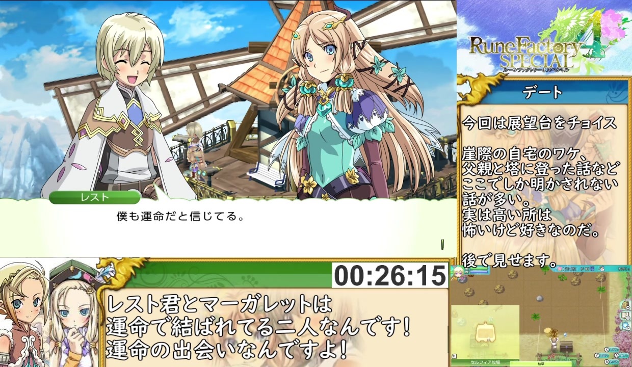ぐーぜんだって運命だ。<br><br><br>マーガレットのゲーム内最短結婚日数についてコメントがあったので、<br>以前挑戦した時の記録を載せておきます。<br><span style="color: #000000; font-size: 14px;">1年目春の30日で結婚いたしました。<br>→</span><span style="color: #006699; font-size: 14px;"><a href="https://take-jingle.hatenablog.com/entry/2020/04/09/222138" target="_blank" rel="noopener nofollow">https://take-jingle.hatenablog.com/entry/2020/04/09/222138</a></span><br><br><span style="color: #333333; font-size: 16px;">サブイベント「ポコリーヌへの恩返し」</span><span style="color: #333333; font-size: 16px;"><strong> </strong></span><span style="color: #262626; font-size: 16px;"><a href="#" class="seekTime" data-seekTime="21:50" onclick="seekNicoPlayer('#21:50'); return false;">#21:50</a></span><br>マーガレットへの告白と返事 <span style="color: #006699; font-size: 16px;"><a href="#" class="seekTime" data-seekTime="1:03" onclick="seekNicoPlayer('#1:03'); return false;">#1:03</a></span><br><br>前→<a href="https://www.nicovideo.jp/watch/sm36541024" class="watch">sm36541024</a><br><br>次→<a href="https://www.nicovideo.jp/watch/sm36689304" class="watch">sm36689304</a><br><br><br>計測開始 始めから を押した瞬間<br>計測終了 結婚式が始まる瞬間<br><br>無編集版<br><a href="https://www.youtube.com/watch?v=OZ2qwwLMFlU&list=LLUorOyxhNRT2PZJkvx9FvOg&index=8&t=1339s" target="_blank" rel="noopener nofollow">https://www.youtube.com/watch?v=OZ2qwwLMFlU&list=LLUorOyxhNRT2PZJkvx9FvOg&index=8&t=1339s</a><br><br>YouTube版<br><a href="https://www.youtube.com/watch?v=pAkTNJ8Sbfo&list=LLeIRq_j5pj_h2OpM5t_Q6Xw&index=2&t=719s" target="_blank" rel="noopener nofollow">https://www.youtube.com/watch?v=pAkTNJ8Sbfo&list=LLeIRq_j5pj_h2OpM5t_Q6Xw&index=2&t=719s</a>