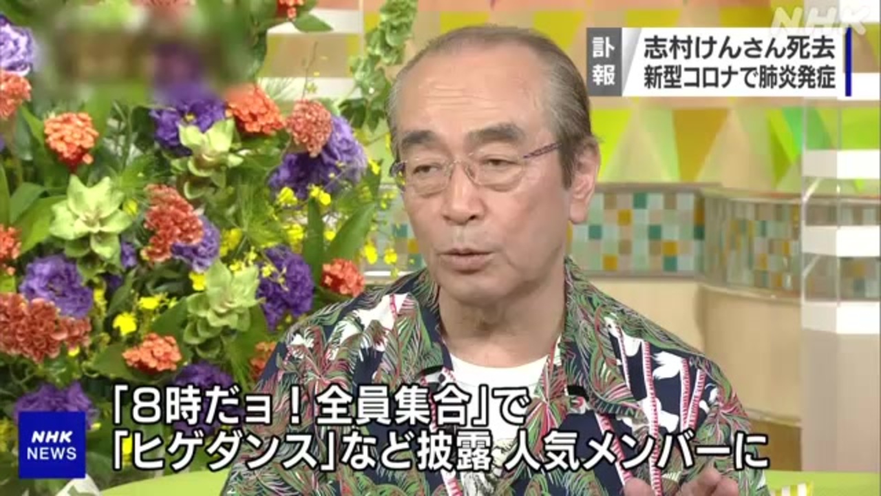 2020年3月30日 9時48分 <br>武漢ウィルスに感染して肺炎を発症し、入院して治療を受けていたコメディアンの志村けんさんが、29日、東京都内の病院で亡くなりました。70歳でした。<br>志村けんさんは、3月17日にけん怠感などの症状が出たあと、東京都内の病院に搬送されて重度の肺炎と診断されて入院し、25日に所属事務所が武漢ウィルスへの感染を公表しました。<br>その後も入院して治療が続けられていましたが、関係者によりますと29日夜、東京都内の病院で亡くなったということです。<br>志村さんは昭和25年に東京 東村山市で生まれ、高校時代に、いかりや長介さんをリーダーとする人気コミックバンド「ザ・ドリフターズ」の付き人となり、昭和49年に正式なメンバーとなりました。民放の公開バラエティー番組「8時だョ!全員集合」では、持ちネタの「東村山音頭」や、チョビひげ姿で加藤茶さんと踊る「ヒゲダンス」などを披露し、一躍人気メンバーとなりました。<br>その後も、自身の冠番組で「バカ殿様」や「変なおじさん」などの個性的なキャラクターを生み出し、「アイーン」や「だっふんだ」などのギャグは世代を超えて親しまれてきました。長年にわたってテレビのタレントとして活躍する一方、平成18年からは自身が座長を務める舞台の公演を続け、コントのほか三味線の演奏を披露するなど、幅広い活動を続けてきました。<br>志村さんは、70歳を迎えたあともバラエティー番組の司会を務めるなど、精力的に活動していましたが、武漢ウィルスに感染して肺炎を発症し、29日夜、東京都内の病院で亡くなりました。70歳でした。<br>