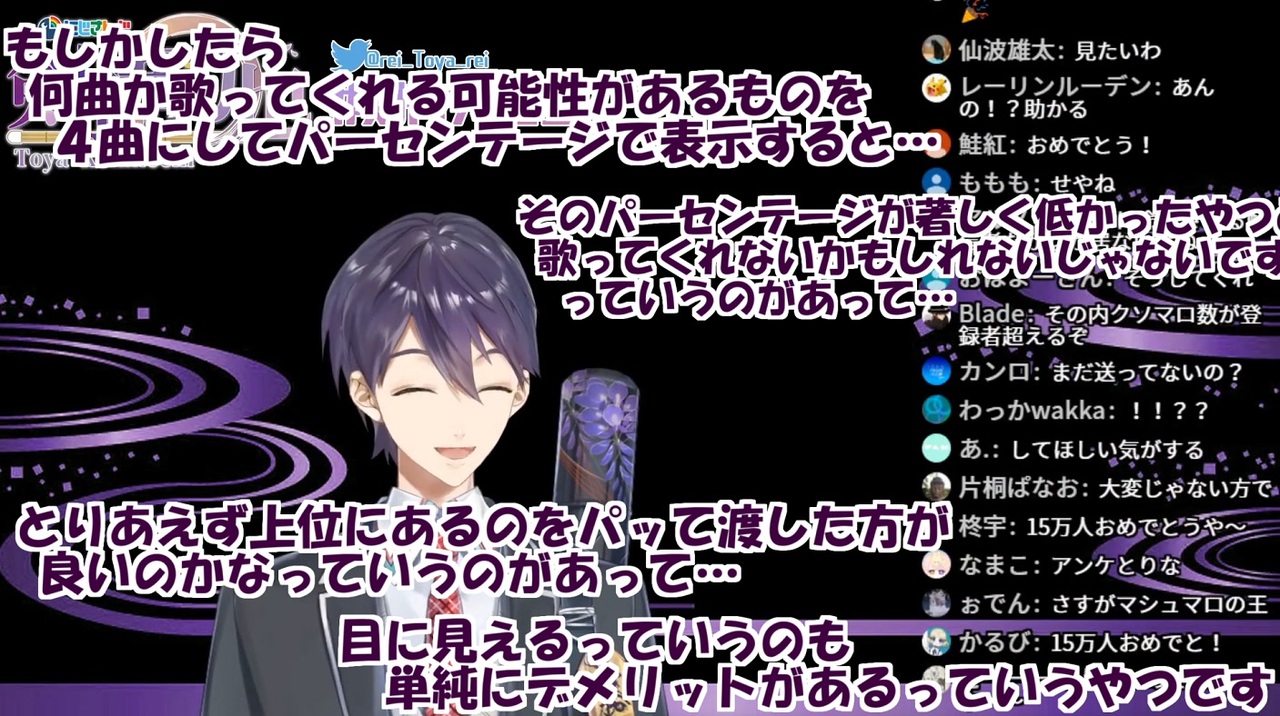 最高でしたね<br>・剣持刀也<br>【Youtube】<a href="https://www.youtube.com/channel/UCv1fFr156jc65EMiLbaLImw?sub_confirmation=1" target="_blank" rel="noopener nofollow">https://www.youtube.com/channel/UCv1fFr156jc65EMiLbaLImw?sub_confirmation=1</a><br>【Twitter】 <a href="https://twitter.com/rei_Toya_rei" target="_blank" rel="noopener nofollow">https://twitter.com/rei_Toya_rei</a><br>・しぐれうい<br><span style="color: #000000; font-size: 14px;">【Youtube】</span><a href="https://www.youtube.com/channel/UCt30jJgChL8qeT9VPadidSw?sub_confirmation=1" target="_blank" rel="noopener nofollow">https://www.youtube.com/channel/UCt30jJgChL8qeT9VPadidSw?sub_confirmation=1</a><br><span style="color: #000000; font-size: 14px;">【Twitter】 </span><a href="https://twitter.com/ui_shig" target="_blank" rel="noopener nofollow">https://twitter.com/ui_shig</a><br>▼元動画<br>どうぶつが集まってるゲームやる(2020/3/28)<br><a href="https://www.youtube.com/watch?v=hkDeYAEwJxg" target="_blank" rel="noopener nofollow">https://www.youtube.com/watch?v=hkDeYAEwJxg</a><br>・該当箇所(52:33~)<br><a href="https://www.youtube.com/watch?v=hkDeYAEwJxg&feature=youtu.be&t=3153" target="_blank" rel="noopener nofollow">https://www.youtube.com/watch?v=hkDeYAEwJxg&feature=youtu.be&t=3153</a><br>▼その後のロリうい歌枠<br>うい・おん・すてーじ<br><a href="https://www.youtube.com/watch?v=TApv3MrGSnk" target="_blank" rel="noopener nofollow">https://www.youtube.com/watch?v=TApv3MrGSnk</a><br>