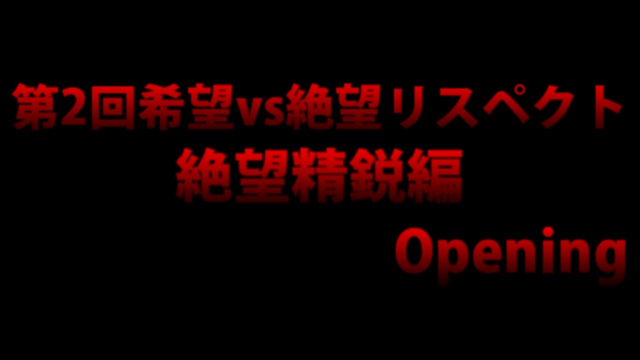 懲りずにまたエイプリルフールの次の日に投稿させていただきました。<br>企画倒れ率が高いルールでなかなかややこしいので最初は深く見なくてヨシ!<br><br>一応は続編という形で始めさせてもらいます。<br><br>実はまだ戦績表の編集が完成してないので次は遅くなるかもしれません。<br>気長に待っていただけると幸いです。<br><br>※想定ランクを曖昧にしたのは私がわからなかったからです<br><br>キャラ設定ブロマガ 希望軍→<a href="https://ch.nicovideo.jp/article/ar1464954" target="_blank" rel="noopener">ar1464954</a> 絶望軍→<a href="https://ch.nicovideo.jp/article/ar1883251" target="_blank" rel="noopener">ar1883251</a><br><br>次→<a href="https://www.nicovideo.jp/watch/sm36649309" class="watch">sm36649309</a><br>今大会マイリス→<a href="https://www.nicovideo.jp/mylist/67948539" target="_blank" rel="noopener">mylist/67948539</a><br>前大会マイリス→<span style="color: #006699; font-size: 14px;"><a href="https://www.nicovideo.jp/mylist/61513790" target="_blank" rel="noopener">mylist/61513790</a></span>