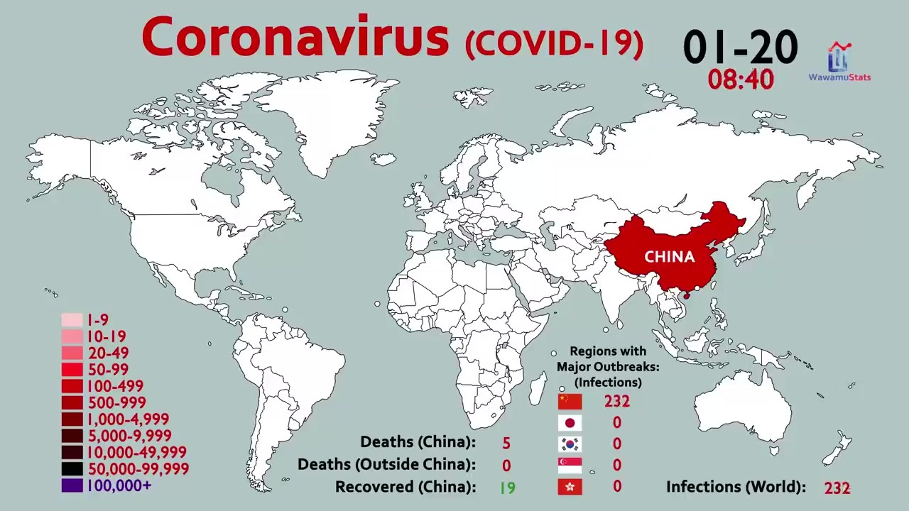 武漢肺炎ウイルスが世界に感染拡大する様を世界地図上で...