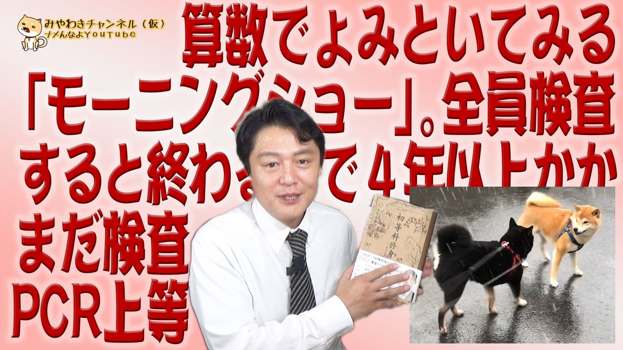 0:05 負けて泣くならやるながミヤワキ家の家訓<br>2:29 全員検査が終わるまで240週かかる計算<br>4:36 算数を基本とする科学者の発想でない専門家<br>7:44 式にこだわり答えにたどりつかないパターン<br>10:07 有事のいま、あの時代の「道徳」の教科書<br>14:02 今回のワンコ「スタート」<br><br><br><br>みやわきチャンネル(仮)は、2019年12月10日のYouTube規約変更後の新しいガイドラインに基づいて、全ての番組を制作・編集・配信しております。<br><br>みやわきチャンネル(仮)#772Restart632<br>オリジナル2020年4月1日配信予定<br><br>番組の最後に「柴犬」のコーナーがあります。<br>今回のワンコ「スタート」<br><br>■YouTubeでの限定動画についてはこちらから。<br>↓よろしければどうぞ。<br><a href="https://foomii.com/00189" target="_blank" rel="noopener nofollow">https://foomii.com/00189</a><br><br>■「みやチャン(仮)」公式サイト「MiyawakiNewsNetwork」<br><a href="http://www.miyawakiatsushi.net" target="_blank" rel="noopener nofollow">http://www.miyawakiatsushi.net</a><br><br>■ツイッター<br><a href="https://twitter.com/miyawakiatsushi" target="_blank" rel="noopener nofollow">https://twitter.com/miyawakiatsushi</a><br>■Facebook<br><a href="https://www.facebook.com/miyawakiatsushi" target="_blank" rel="noopener nofollow">https://www.facebook.com/miyawakiatsushi</a>