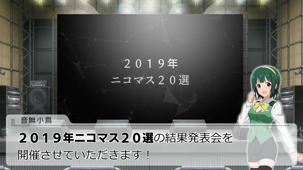 対象期間:2019年1月 ~ 12月<br>募集期間:2019年7月(上)、2020年1月(下)<br><br>企画案内:<br> 半年ごとに皆さんのお好きなニコマス作品を20作品以内で紹介してもらっている企画です。<br> ★今回は、2019年上半期と下半期の2期分の結果を合わせてご紹介いたします★<br><br>20選wiki:<a href="https://w.atwiki.jp/dassyu/" target="_blank" rel="noopener nofollow">https://w.atwiki.jp/dassyu/</a><br><br>紹介した動画一覧(ブロマガ)[vol.1:<a href="https://ch.nicovideo.jp/article/ar1884438" target="_blank" rel="noopener">ar1884438</a>][vol.2:<a href="https://ch.nicovideo.jp/article/ar1884442" target="_blank" rel="noopener">ar1884442</a>]<br><br>[vol.1:<span style="color: #000000; font-size: 13px;">再生中</span>][vol.2:<span style="color: #000000; font-size: 14px;"><a href="https://www.nicovideo.jp/watch/sm36628375" class="watch">sm36628375</a></span>]<br>
