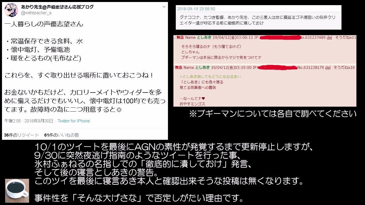 あかり先生の騒動関連まとめです。<br><br>騒動wiki:<a href="https://kemono2.memo.wiki/d/%a4%a2%a4%ab%a4%ea%c0%e8%c0%b8" target="_blank" rel="noopener nofollow">https://kemono2.memo.wiki/d/%a4%a2%a4%ab%a4%ea%c0%e8%c0%b8</a><br>ツイッター:<a href="https://twitter.com/withteacher_a" target="_blank" rel="noopener nofollow">https://twitter.com/withteacher_a</a><br>ブログ:<a href="http://www.ayatoshi.com/" target="_blank" rel="noopener nofollow">http://www.ayatoshi.com/</a><br>サイトの情報検索:<a href="https://www.aguse.jp" target="_blank" rel="noopener nofollow">https://www.aguse.jp</a><br>参考:<a href="https://www.nicovideo.jp/watch/sm35016997" class="watch">sm35016997</a>、<a href="https://www.nicovideo.jp/watch/sm35158488" class="watch">sm35158488</a>、<a href="https://www.nicovideo.jp/watch/sm35271097" class="watch">sm35271097</a>、<a href="https://www.nicovideo.jp/watch/sm36033147" class="watch">sm36033147</a>、<a href="https://www.nicovideo.jp/watch/sm35247692" class="watch">sm35247692</a>、<a href="https://www.nicovideo.jp/watch/sm36033147" class="watch">sm36033147</a><br><br><br>関連動画まとめたマイリスト:<a href="https://www.nicovideo.jp/mylist/67462831" target="_blank" rel="noopener">mylist/67462831</a><br>ツイッター:<a href="https://twitter.com/kemo2bombot" target="_blank" rel="noopener nofollow">https://twitter.com/kemo2bombot</a>