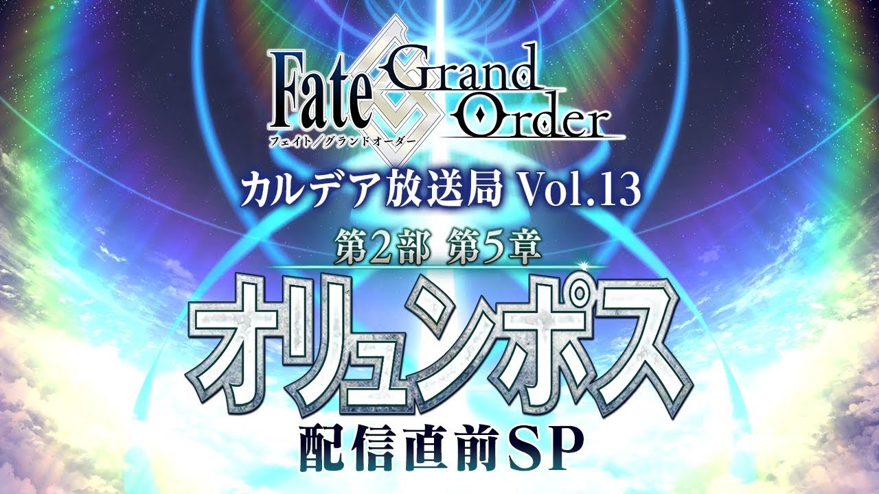 <span style="color: #030303; font-size: 14px;">「Fate/Grand Order カルデア放送局 Vol.13 第2部 第5章 オリュンポス 配信直前SP」の配信に関しまして<br><br>2020年4月8日(水)に配信予定の「Fate/Grand Order カルデア放送局 Vol.13 第2部 第5章 オリュンポス 配信直前SP」に関しまして、新型コロナウイルス感染拡大に伴う行政機関の発表を考慮し検討を重ねた結果、出演者の安全を鑑みキャスト登壇の中止をさせていただくこととなりました。<br>変更内容の詳細は以下をご確認ください。<br>何卒ご理解を賜りますようお願い申し上げます。<br><br> <br>『Fate/Grand Order』メインクエスト第2部 第5章 「Lostbelt No.5 星間都市山脈 オリュンポス 神を撃ち落とす日」がいよいよ配信!<br> <br>今回の放送は、まもなく配信予定のメインクエスト第2部 第5章「Lostbelt No.5 星間都市山脈 オリュンポス 神を撃ち落とす日」の情報を公開!<br>そのほか、FGO PROJECTやFate PROJECTなど、最新情報をお届けします!<br>ぜひ、お見逃しなく!!<br><br> <br>■事前番組 </span>19:20<span style="color: #030303; font-size: 14px;">〜</span><br><span style="color: #030303;"> <br>■本編番組 </span>19:30<span style="color: #030303; font-size: 14px;">〜</span><br><br><br><span style="color: #030303;">出演者<br>Fate/Grand Order 開発・宣伝スタッフ<br>※キャストの出演は中止となりました。何卒ご理解を賜りますようお願い申し上げます。</span><br />Fate関係マイリスト作りました<br>過去の動画はこちらからどうぞ<br>【Part6】<a href="https://www.nicovideo.jp/mylist/77458014" target="_blank" rel="noopener">mylist/77458014</a><br>【Part5】<a href="https://www.nicovideo.jp/mylist/72367759" target="_blank" rel="noopener">mylist/72367759</a><br>【Part4】<a href="https://www.nicovideo.jp/mylist/69569102" target="_blank" rel="noopener">mylist/69569102</a><br>【Part3】<a href="https://www.nicovideo.jp/mylist/66190415" target="_blank" rel="noopener">mylist/66190415</a><br>【Part2】<a href="https://www.nicovideo.jp/mylist/63296233" target="_blank" rel="noopener">mylist/63296233</a><br>【Part1】<a href="https://www.nicovideo.jp/mylist/60253726" target="_blank" rel="noopener">mylist/60253726</a><br><br><br>