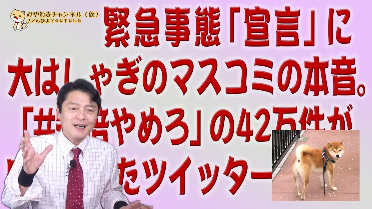 0:05 日暮里・舎人ライナーを制限できる宣言が<br>2:22 プロデューサー情報なので確度の高い情報<br>5:18 ソースまだ?と根拠と論拠を求める「作法」<br>7:39 コロナ疎開とキャッチーな言葉で読者の関心<br>9:42 #安倍やめろの42万件が突然消えたネット<br>14:15 今回のワンコ「いっしょ」<br><br>みやわきチャンネル(仮)は、2019年12月10日のYouTube規約変更後の新しいガイドラインに基づいて、全ての番組を制作・編集・配信しております。<br><br>みやわきチャンネル(仮)#778Restart638<br>オリジナル2020年4月7日配信予定<br><br>番組の最後に「柴犬」のコーナーがあります。<br>今回のワンコ「いっしょ」<br><br>■YouTubeでの限定動画についてはこちらから。<br>↓よろしければどうぞ。<br><a href="https://foomii.com/00189" target="_blank" rel="noopener nofollow">https://foomii.com/00189</a><br><br>■「みやチャン(仮)」公式サイト「MiyawakiNewsNetwork」<br><a href="http://www.miyawakiatsushi.net" target="_blank" rel="noopener nofollow">http://www.miyawakiatsushi.net</a><br><br>■ツイッター<br><a href="https://twitter.com/miyawakiatsushi" target="_blank" rel="noopener nofollow">https://twitter.com/miyawakiatsushi</a><br>■Facebook<br><a href="https://www.facebook.com/miyawakiatsushi" target="_blank" rel="noopener nofollow">https://www.facebook.com/miyawakiatsushi</a><br>