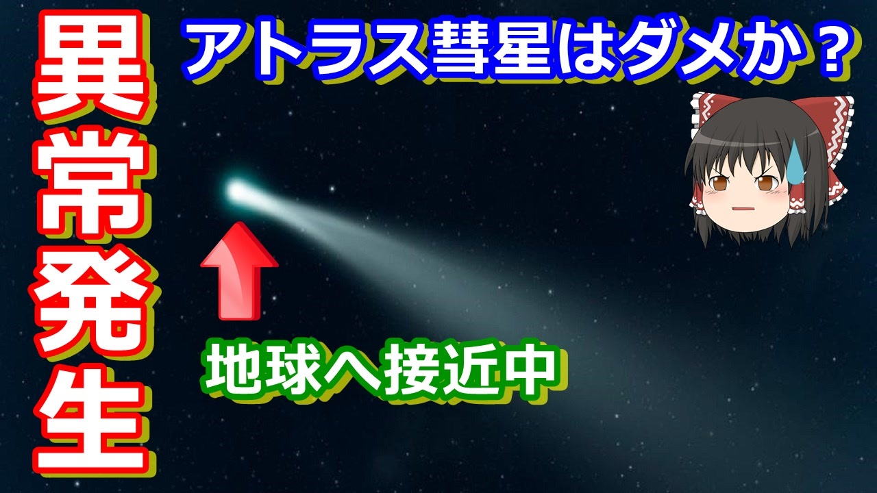 <span style="color: rgba(0, 0, 0, 0.87);">今世紀最大の明るさとも期待されていたアトラス彗星に異常発生!<br>5月の大接近を前に力尽きるのか?<br>以前解説した動画をご覧になってから見たほうが幸せになります<br><br>以前のアトラス彗星解説 → </span><a href="https://www.nicovideo.jp/watch/sm36560231" class="watch">sm36560231</a><span style="color: rgba(0, 0, 0, 0.87);"> <br><br>へえ~と思ったらチャンネル登録と高評価をお願います<br>ツイッターでは、たまに宇宙ネタをつぶやいています<br><br>いつもたくさん広告していただき、本当にありがとうございます<br>有料課金広告はもったいないので、他のいい動画へお願いします</span><br><br>●マイリスト集はこちら<br><span style="color: #006699;"><a href="https://ch.nicovideo.jp/skysanpei/blomaga/ar1828398" target="_blank" rel="noopener nofollow">https://ch.nicovideo.jp/skysanpei/blomaga/ar1828398</a></span><br><span style="color: rgba(0, 0, 0, 0.87);">◆チャンネル登録はこちら</span><br><span style="color: #006699;"><a href="http://www.youtube.com/channel/UChOv-TZWg3X4MDjFUF8CfQg?sub_confirmation=1" target="_blank" rel="noopener nofollow">http://www.youtube.com/channel/UChOv-TZWg3X4MDjFUF8CfQg?sub_confirmation=1</a></span><br><span style="color: rgba(0, 0, 0, 0.87);">◆サブチャンネル(スカイ三平の雑多推進研究所)</span><br><span style="color: #006699;"><a href="http://www.youtube.com/channel/UCpQEOLtOpmXUwslvgi93yQw?sub_confirmation=1" target="_blank" rel="noopener nofollow">http://www.youtube.com/channel/UCpQEOLtOpmXUwslvgi93yQw?sub_confirmation=1</a></span><br><span style="color: rgba(0, 0, 0, 0.87);">◆twitterはこちら</span><br><span style="color: #006699;"><a href="https://twitter.com/skysanpei" target="_blank" rel="noopener nofollow">https://twitter.com/skysanpei</a></span><br>