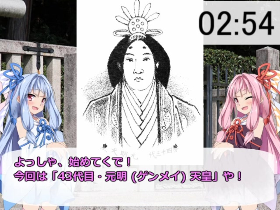 今日 (4月9日) は「大仏の日」ということで、予定より少し早めに投稿しました。<br>というわけで、今回から「奈良時代編」に突入です!<br><br>●元明 (げんめい) 天皇 基本プロフィール <br> 父 天智天皇<span style="color: #262626;"> (第四皇女</span>) 母<strong> </strong> 蘇我姪娘<span style="color: #000000;"> (蘇我倉山田石川麻呂娘)</span><br><span style="color: #262626;"> </span>在位 707年 ~ 715年 (9年間) <br> 生涯 661年 ~ 721年 (61歳)<br><br>●1代目 神武天皇 → <a href="https://www.nicovideo.jp/watch/sm33459779" class="watch">sm33459779</a> <br> 42代目 文武天皇 →<span style="color: #262626;"> </span><span style="color: #262626; font-size: 14px;"><a href="https://www.nicovideo.jp/watch/sm36608886" class="watch">sm36608886</a></span> 44代目 元正天皇 → <a href="https://www.nicovideo.jp/watch/sm36845385" class="watch">sm36845385</a><br><br>●このころの世界<br> 711年 ウマイヤ朝、イベリア半島に進出 (西ゴート王国滅亡)<br> 712年 唐で玄宗が即位 (「開元の治」) <br><br>●3分天皇紹介リスト → <a href="https://www.nicovideo.jp/mylist/62530271" target="_blank" rel="noopener">mylist/62530271</a> ついったー @inocchi_0515<br><span style="color: #ff0000;">●いのっちHPを開設いたしました!</span> → <a href="https://inocchi-douga.com/" target="_blank" rel="noopener nofollow">https://inocchi-douga.com/</a>