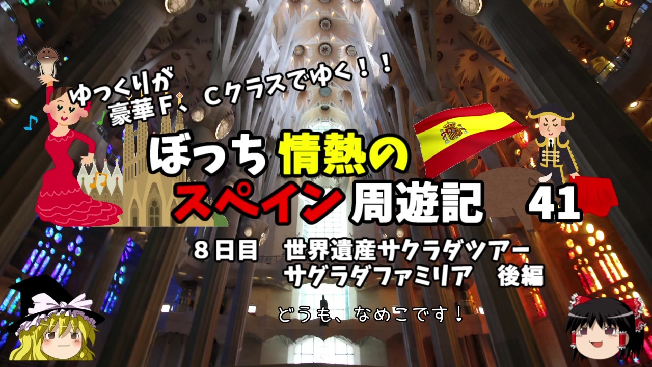 <span style="color: #ff0000; font-size: medium;"><u>※Youtubeで1話分、先行配信中 </u></span><br><span style="color: #0000ff; font-size: medium;"> <a href="http://www.youtube.com/c/なめこのぼっち旅" target="_blank" rel="noopener nofollow">http://www.youtube.com/c/なめこのぼっち旅</a></span><br><br><br>今回はかの有名な世界遺産、<br>サグラダファミリアを紹介します!<br><br><span style="color: #ff0000;">コミュニティー→co2910020</span><br><br>twitter→<a href="https://twitter.com/ryontan" target="_blank" rel="noopener nofollow">https://twitter.com/ryontan</a><br><br><a href="https://www.nicovideo.jp/watch/sm36624898" class="watch">sm36624898</a>←前回 <span style="color: #ff0000;">次回 第42話→</span><a href="https://www.nicovideo.jp/watch/sm36699695" class="watch">sm36699695</a><br><br>解説・雑談系→<a href="https://www.nicovideo.jp/mylist/63171869" target="_blank" rel="noopener">mylist/63171869</a><br>今作 スペイン周遊記→<a href="https://www.nicovideo.jp/mylist/64537827" target="_blank" rel="noopener">mylist/64537827</a><br>前作 韓国トルコ旅行記→<a href="https://www.nicovideo.jp/mylist/63654428" target="_blank" rel="noopener">mylist/63654428</a><br>車中泊旅行記→<a href="https://www.nicovideo.jp/mylist/54706524" target="_blank" rel="noopener">mylist/54706524</a><br>久米島(沖縄)旅行記→<a href="https://www.nicovideo.jp/mylist/63059251" target="_blank" rel="noopener">mylist/63059251</a><br>イギリスタイ旅行記→<a href="https://www.nicovideo.jp/mylist/60044833" target="_blank" rel="noopener">mylist/60044833</a><br>クルーズ旅行記→<a href="https://www.nicovideo.jp/mylist/57397685" target="_blank" rel="noopener">mylist/57397685</a><br>ドイツ周遊記→<a href="https://www.nicovideo.jp/mylist/54938346" target="_blank" rel="noopener">mylist/54938346</a><br>北海道旅行記→<a href="https://www.nicovideo.jp/mylist/52618057" target="_blank" rel="noopener">mylist/52618057</a><br>アメリカ横断記→<a href="https://www.nicovideo.jp/mylist/48621785" target="_blank" rel="noopener">mylist/48621785</a><br>イタリア周遊記→<a href="https://www.nicovideo.jp/mylist/45763559" target="_blank" rel="noopener">mylist/45763559</a><br>NY旅行記→<a href="https://www.nicovideo.jp/mylist/44343854" target="_blank" rel="noopener">mylist/44343854</a>