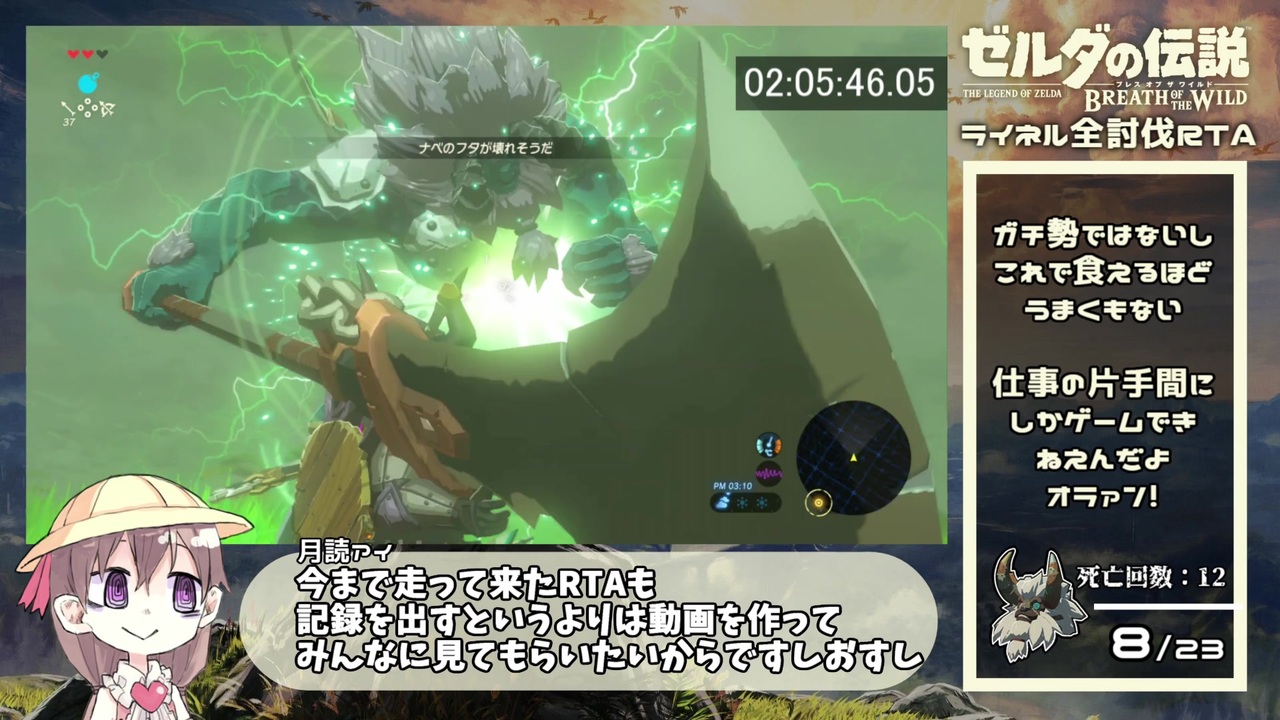 <span style="color: #ff0000; font-size: 24px;"><strong>ガバの伝説</strong></span><br><span style="color: #ff0000;"><strong>この動画は多数のガバが含まれています</strong></span><br><strong>前回は20万ポイントもの広告ありがとうございました。</strong><br><br>編集センスが良いと言われても私の編集スタイルが適当すぎて<br>自信が持てないので初投稿です。<br><span style="color: #ffffff; font-size: 10px;">4:54(5)に投稿しようとしたらアップロード間に合わない!!!<br>でも8:10まで待ちきれないよ!!!もういいや…</span><br>【ルール】<br>「はじめから」を選択した瞬間から計測開始、<br>ライネル全23体を倒しスタンプを押した瞬間まで計測。<br>・バグ技とかは特に禁止していません。<br><br>【環境】<br>ぱそこん:ねぬいーしー<br>キャプボ:I-O Data GV-USB3/HD<br>ゲーム機:Nintendo Switch<br><br>前Part:<a href="https://www.nicovideo.jp/watch/sm36650133" class="watch">sm36650133</a><br>次Part:<a href="https://www.nicovideo.jp/watch/sm36713342" class="watch">sm36713342</a><br>無編集版:<a href="https://www.nicovideo.jp/watch/sm36937895" class="watch">sm36937895</a><br><br><br>★biimシステムリスペクトです★<br>★淫夢要素はないです★<br><br>★お借りした素材★<br>月読アイちゃん先輩立ち絵(ゆぬきうた 様) ☛<a href="https://seiga.nicovideo.jp/seiga/im9925592" target="_blank" rel="noopener">im9925592</a>