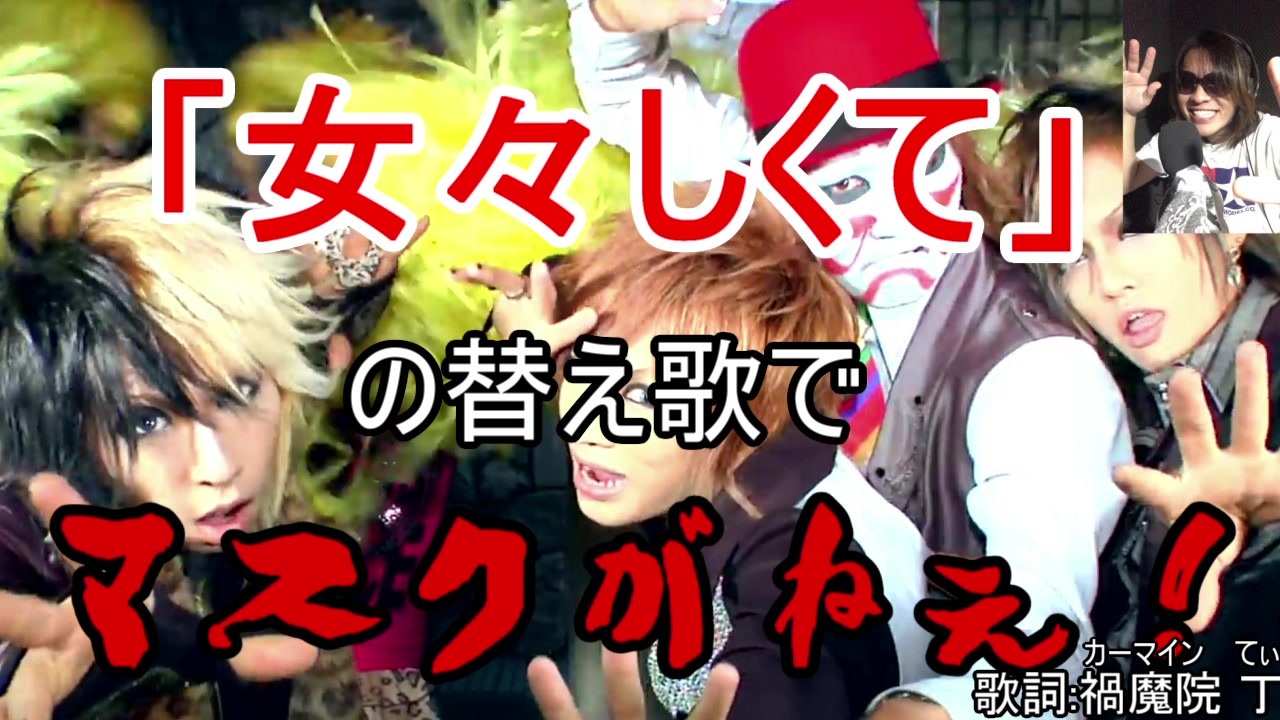 <span style="color: rgba(0, 0, 0, 0.87); font-size: 15px;">どうも初めまして、禍魔院 丁(カーマイン てぃ)です。<br>そして鬼龍院さん、ごめんなさい□♂️<br>大変なご時世ですが、この動画を見て少しでも笑ってもらえたら幸いです。<br><br>先日、ゴールデンボンバーの鬼龍院 翔さんが<br>つい最近有名になった「女々しくて」の替え歌に触発されたのか、「マスクがねぇ」と短いセルフ替え歌をしていたので<br>勝手にフルバージョンを頑張って作ってみました。<br><br><br>歌は下手なのでご了承ください□♂️<br><br>皆もマスクに限らず、買い占め・転売はやめようね!</span><br><br>Youtube→<a href="https://www.youtube.com/watch?v=tCB1WULEhgs" target="_blank" rel="noopener nofollow">https://www.youtube.com/watch?v=tCB1WULEhgs</a><br><span style="color: rgba(0, 0, 0, 0.87); font-size: 15px;">T.カーマインのTwitterアカウント→ <a href="https://twitter.com/Godmine01" target="_blank" rel="noopener nofollow">https://twitter.com/Godmine01</a></span>