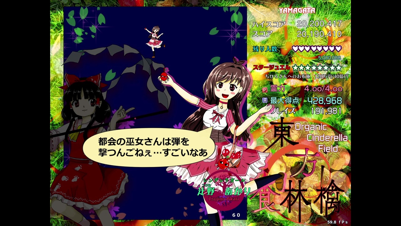 ???「おいしい山形りんごをどうぞ!」<br>??「あ、ご丁寧にどうも」<br><br>こっちもよかったら見てみて下さいね。東方食林檎ワールドはいいぞ。<br><span style="color: #32475e; font-size: 13px;"><a href="https://www.nicovideo.jp/watch/sm36620698" class="watch">sm36620698</a></span><br><br>6ボス編→<span style="color: #32475e; font-size: 13px;"><a href="https://www.nicovideo.jp/watch/sm36862472" class="watch">sm36862472</a></span><br><br>なんかゲーム化されたっぽいです→<span style="color: #32475e; font-size: 13px;"><a href="https://www.nicovideo.jp/watch/sm36892838" class="watch">sm36892838</a></span><br><br>えばんさん、テトアイスさん、<span style="font-size: 14px;">カジミェシュさん、朧月さん、わいななさん、sipsclarkさん、ごれさん、三八七さん、ラルムさん、hatekoさん、ゲストさん、上南さん、笑い生活二十四時さん、楽兎さん、ヤギ座さん、</span><span style="color: #000000; font-size: 13px;">武音(ぶおん)さん、サンクタスさん、sipsclarkさん、ごんぞうさん、ケズドさん、riseryさん、Emperorさん、</span><span style="font-size: 14px;">ハイチオールC1000さん、おりんりんランドさん、natsu-kichiさん、dearcoalさん、瀕死の不死者(ニット)さん、eofさん、勇太郎さん、</span><span style="color: #000000; font-size: 13px;">さびしたさん、あーけいさん、dokuさん、シゼンナ コオリナオシさん、寝ヲチさん、mashogeさん、こたつさん、ウエポンさん、たまごかけごはんさん、rarara・夢さん、</span><span style="font-size: 14px;">鬱野郎さん、</span><span style="color: #000000; font-size: 13px;">たつたずきさん、eofさん</span>広告ありがとうございます★☆★☆♪<br><br>皆さんのお陰で辻野あかりがボイスシンデレラガールになりました。みんなおめでとう!
