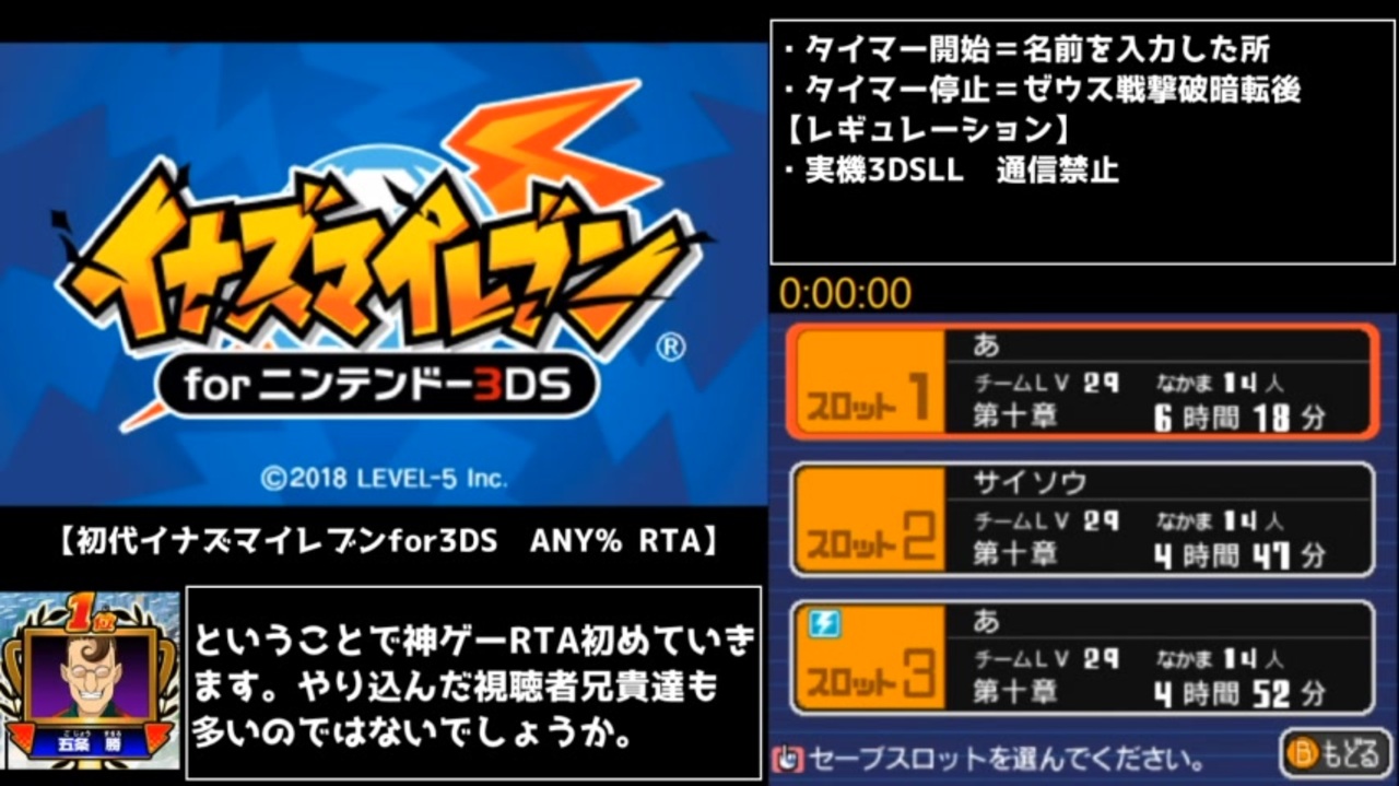日本人でまだ誰も走ってなかったので走りました。<br>更新頻度は若干遅めになるかもしれません。<br><br>なるべく反映できるコメントは動画内で反応します。<br><br>次→<a href="https://www.nicovideo.jp/watch/sm36725105" class="watch">sm36725105</a><br>全部つなげた動画→<a href="https://www.youtube.com/watch?v=v08CDvmmMP8&feature=youtu.be" target="_blank" rel="noopener nofollow">https://www.youtube.com/watch?v=v08CDvmmMP8&feature=youtu.be</a><br>他RTApart1マイリスト<a href="https://www.nicovideo.jp/mylist/60210567" target="_blank" rel="noopener">mylist/60210567</a><br>--------------------------------------------------------------------<br>【イナズマイレブン RTA ルール】<br>計測開始:名前を決定した瞬間<br>計測終了:世宇子中撃破後のムービー<br><br>禁止事項:通信機能の使用<br><br>環境:3DSLL(偽トロ) タッチペン操作<br>---------------------------------------------------------------------<br><br>【チャンネル登録・お気に入りツイッターフォローの方よろしくお願いします。】<br>ツイッター→<a href="https://twitter.com/silentair100" target="_blank" rel="noopener nofollow">https://twitter.com/silentair100</a><br>youtubeチャンネル→<a href="https://www.youtube.com/user/SilentAir100" target="_blank" rel="noopener nofollow">https://www.youtube.com/user/SilentAir100</a> <br><br>