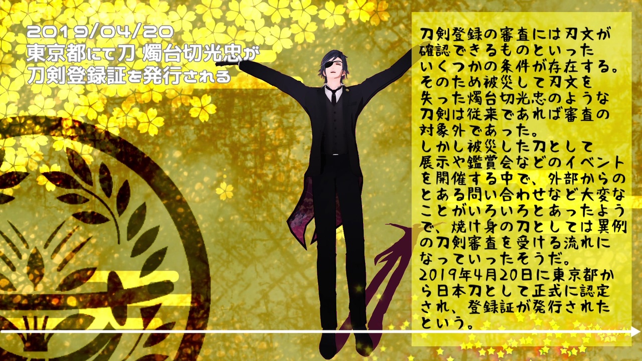<span style="color: #0000ff; font-size: 16px;">広告、ご視聴ありがとうございます。<br>お名前は一人一人確認させて頂いてます。感謝!</span><br><br>大変な時期ですが、刀剣乱舞五周年と燭台切光忠刀剣登録一周年、おめでとうございます。<br>去年の5月18日に刀剣登録の話を知った時は舞い上がるほど嬉しかったです。<br>大正で一度止まったかのように思われていた燭台切光忠の歴史が平成から怒涛の勢いでまた動き出した感じがドラマチックで大好きです。<br>190年後の未来も会いに行ける刀でありますように。<br>脈々と受け継がれてきた人の想いや歴史がこれからも守られていくことを願っております。<br><br>動画は個人的に印象に残っている燭台切に纏わるネタあれこれを出来るだけ時系列で視覚化しやすかったものを中心にまとめたものです。<br>実在の刀の燭台切と刀剣男士の燭台切のネタがゴチャ混ぜですのでご注意ください。<br>何故そこを拾った?あのネタがない?などあるかもしれませんが、個人の勝手な寄せ集めです。<br>字幕ゴテゴテであれってもうそんなに前なのかとか懐かしく4分で振り返る的な動画です。<br>駅長さんがダブルのスーツじゃなかったり、まあ色々とざっくりなのでざっくりな感じでご覧下さい。<br>声に出して読みたい燭台切ワードに集中線をつけて目立たせておきましたのでよろしく!(2箇所)<br>実際に自分で見聞きしたネタ以外はTwitterなどの有志の方々のレポートを勝手に参考にさせて頂きました。<br>この場を借りてお礼申し上げます。<br>貴重なレポートを読ませて頂き、ありがとうございました。<br>PCスペックが低いので途中で何度もフリーズしたりして悩まされましたが、動画作りそのものは楽しかったです。<br>お借りした製作主の方々、楽しい時間をありがとうございました。<br><br><span style="color: #ff0000; font-size: 24px;">リアルとゲームと二次創作をミキサーにかけたような混沌とした癖の強い動画かと思います。<br>冒頭の注意書きは必ず読んでからご視聴お願いします。<br>苦手だと思ったらブラウザバックでお願いします。</span><br><br><span style="color: #ff00ff;">ニコ動リニューアルしたんですね。<br>遅ればせながら、いいねのメッセージを設定しました。<br>設定前にいいねくださった方もありがとうございました。とても嬉しいです!<br>ご視聴、コメ、マイリス、広告、重ね重ね感謝です!<br>2020/07/28</span>