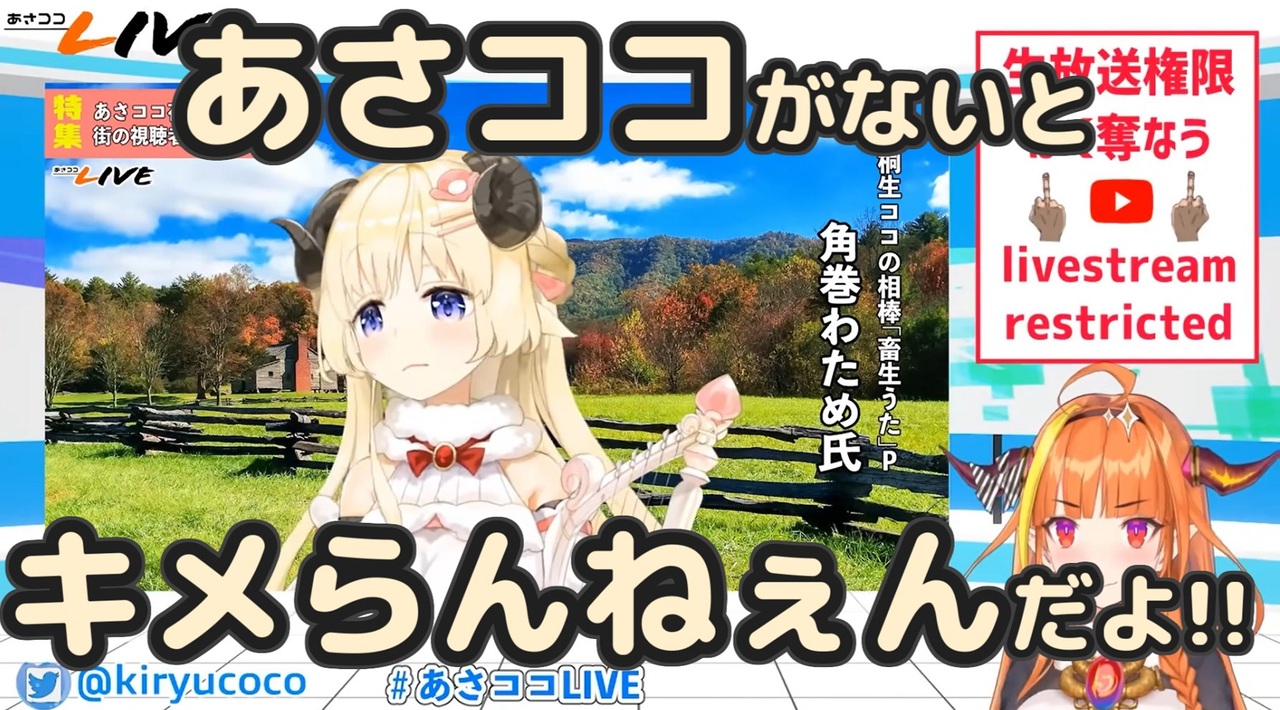 のちに伝説となった桐生ココのバーチャルムショ勤めに関する記録である。<br><br>▼本編:【#桐生ココ】あさココLIVEニュース!4月20日【#ココここ】<br><a href="https://www.youtube.com/watch?v=2di61BNqMek&feature=emb_title" target="_blank" rel="noopener nofollow">https://www.youtube.com/watch?v=2di61BNqMek&feature=emb_title</a><br><br>▼Coco Ch. 桐生ココ<br><a href="https://www.youtube.com/channel/UCS9uQI-jC3DE0L4IpXyvr6w" target="_blank" rel="noopener nofollow">https://www.youtube.com/channel/UCS9uQI-jC3DE0L4IpXyvr6w</a><br><a href="https://twitter.com/kiryucoco" target="_blank" rel="noopener nofollow">https://twitter.com/kiryucoco</a><br>▼フブキCh。白上フブキ<br><a href="https://www.youtube.com/channel/UCdn5BQ06XqgXoAxIhbqw5Rg" target="_blank" rel="noopener nofollow">https://www.youtube.com/channel/UCdn5BQ06XqgXoAxIhbqw5Rg</a><br><a href="https://twitter.com/shirakamifubuki" target="_blank" rel="noopener nofollow">https://twitter.com/shirakamifubuki</a><br>▼Mio Channel 大神ミオ<br><a href="https://www.youtube.com/channel/UCp-5t9SrOQwXMU7iIjQfARg" target="_blank" rel="noopener nofollow">https://www.youtube.com/channel/UCp-5t9SrOQwXMU7iIjQfARg</a><br><a href="https://twitter.com/ookamimio" target="_blank" rel="noopener nofollow">https://twitter.com/ookamimio</a><br>▼Miko Ch. さくらみこ<br><a href="https://www.youtube.com/channel/UC-hM6YJuNYVAmUWxeIr9FeA" target="_blank" rel="noopener nofollow">https://www.youtube.com/channel/UC-hM6YJuNYVAmUWxeIr9FeA</a><br><a href="https://twitter.com/sakuramiko35" target="_blank" rel="noopener nofollow">https://twitter.com/sakuramiko35</a><br>▼Watame Ch. 角巻わため<br><a href="https://www.youtube.com/channel/UCqm3BQLlJfvkTsX_hvm0UmA" target="_blank" rel="noopener nofollow">https://www.youtube.com/channel/UCqm3BQLlJfvkTsX_hvm0UmA</a><br><a href="https://twitter.com/tsunomakiwatame" target="_blank" rel="noopener nofollow">https://twitter.com/tsunomakiwatame</a><br>▼Aqua Ch. 湊あくあ<br><a href="https://www.youtube.com/channel/UC1opHUrw8rvnsadT-iGp7Cg" target="_blank" rel="noopener nofollow">https://www.youtube.com/channel/UC1opHUrw8rvnsadT-iGp7Cg</a><br><a href="https://twitter.com/minatoaqua" target="_blank" rel="noopener nofollow">https://twitter.com/minatoaqua</a><br>▼Korone Ch. 戌神ころね<br><a href="https://www.youtube.com/channel/UChAnqc_AY5_I3Px5dig3X1Q" target="_blank" rel="noopener nofollow">https://www.youtube.com/channel/UChAnqc_AY5_I3Px5dig3X1Q</a><br><a href="https://twitter.com/inugamikorone" target="_blank" rel="noopener nofollow">https://twitter.com/inugamikorone</a><br>▼Flare Ch. 不知火フレア<br><a href="https://www.youtube.com/channel/UCvInZx9h3jC2JzsIzoOebWg" target="_blank" rel="noopener nofollow">https://www.youtube.com/channel/UCvInZx9h3jC2JzsIzoOebWg</a><br><a href="https://twitter.com/shiranuiflare" target="_blank" rel="noopener nofollow">https://twitter.com/shiranuiflare</a>
