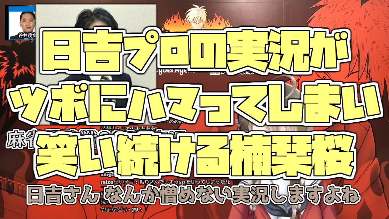 ひたすら笑い続ける姿が大変可愛らしかったので切り抜いてみました!<br><br>日吉プロのツイッター<br><a href="https://twitter.com/tty_hiyoshi" target="_blank" rel="noopener nofollow">https://twitter.com/tty_hiyoshi</a><br><br>麻雀最強戦2020 プロ雀士ランキングベスト16大会<br><a href="https://abema.tv/channels/mahjong/slots/DAXtH9rHFfLuzo" target="_blank" rel="noopener nofollow">https://abema.tv/channels/mahjong/slots/DAXtH9rHFfLuzo</a><br><br>【麻雀最強戦2020】プロ雀士ランキングベスト16大会【裏解説:楠栞桜】<br><a href="https://youtu.be/o3CsgAG7o8g?t=16715" target="_blank" rel="noopener nofollow">https://youtu.be/o3CsgAG7o8g?t=16715</a><br><br>笑い上戸な楠栞桜さんは下記の動画様でも見れますので、よろしければぜひ。<br><br>架空のポケモン「ロドリゲス」がツボにはまり爆笑する楠栞桜<br><a href="https://www.nicovideo.jp/watch/sm36297679" target="_blank" rel="noopener nofollow">https://www.nicovideo.jp/watch/sm36297679</a><br><br>2分間笑い続ける楠栞桜<br><a href="https://www.nicovideo.jp/watch/sm36367118" target="_blank" rel="noopener nofollow">https://www.nicovideo.jp/watch/sm36367118</a><br><br>※一晩経ってからタイトルが間違っていることに気づいたので、サムネと共に<span style="color: #000000; font-size: 14px;">ひっそりと</span>修正(日吉プロの「解説」→「実況」)