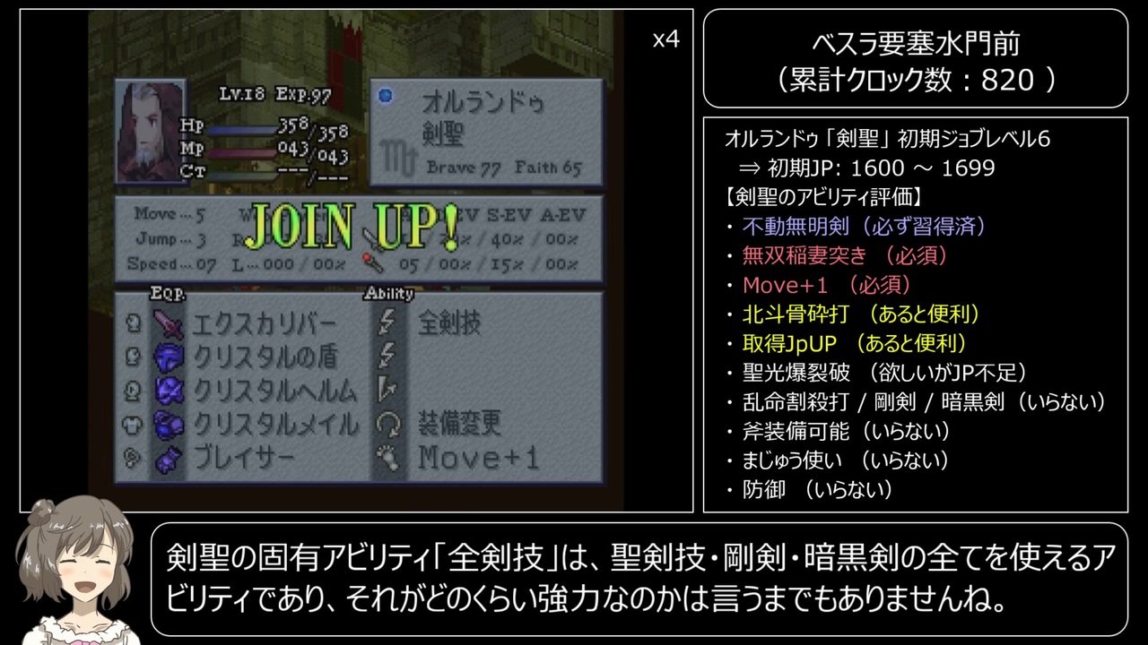 PS版FFTのシナリオを最小クロックでクリアするTAS動画です。<br>合成音声による解説がありますので、苦手な方はご注意ください。<br>プレイ条件の詳細については、Chapter1-1(<a href="https://www.nicovideo.jp/watch/sm35981364" class="watch">sm35981364</a>)、およびChapter2-3(<a href="https://www.nicovideo.jp/watch/sm36306443" class="watch">sm36306443</a>)の動画末尾で補足しています。<br><br><span style="font-size: 13px;">【プレイ条件】</span><br>1. シナリオ順に戦闘を最小クロックでクリア(勝利条件を満たしたクロックまでカウント)<br>2. 移動日数の最小化(アイテム購入目的の移動は可能)<br>3. メモリーカードからのデータロード禁止<br>4. バグの利用禁止(詳細はChapter2-3の動画末尾で補足)<br><br><span style="font-size: 13px;">【プレイ環境】</span><br>エミュレータ: BizHawk 2.3.1<br>最終キー入力: 1053399 F(4:56:06)<br>追記回数: 53912+<br><br><a href="https://www.nicovideo.jp/watch/sm36648519" class="watch">sm36648519</a> < 前:次 > <a href="https://www.nicovideo.jp/watch/sm36811334" class="watch">sm36811334</a><br><span style="color: #000000; font-size: 13px;">クリティカルヒットについて:</span><a href="https://www.nicovideo.jp/watch/sm36058415" class="watch">sm36058415</a><br>マイリスト:<a href="https://www.nicovideo.jp/mylist/66955206" target="_blank" rel="noopener">mylist/66955206</a><br><span style="color: #000000; font-size: 13px;">進捗報告:<a href="https://twitter.com/spherewind1" target="_blank" rel="noopener nofollow">https://twitter.com/spherewind1</a></span>